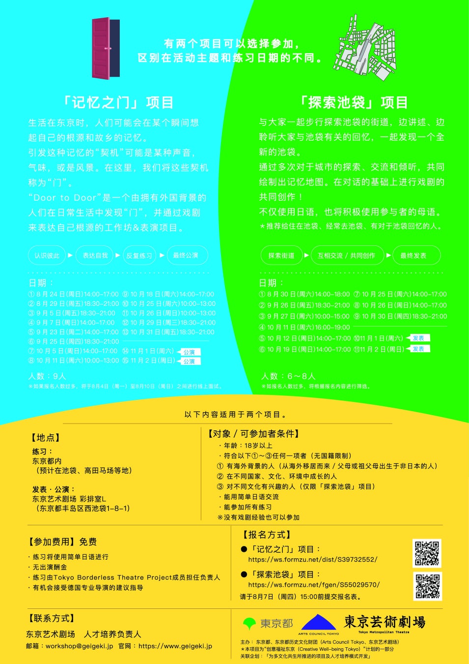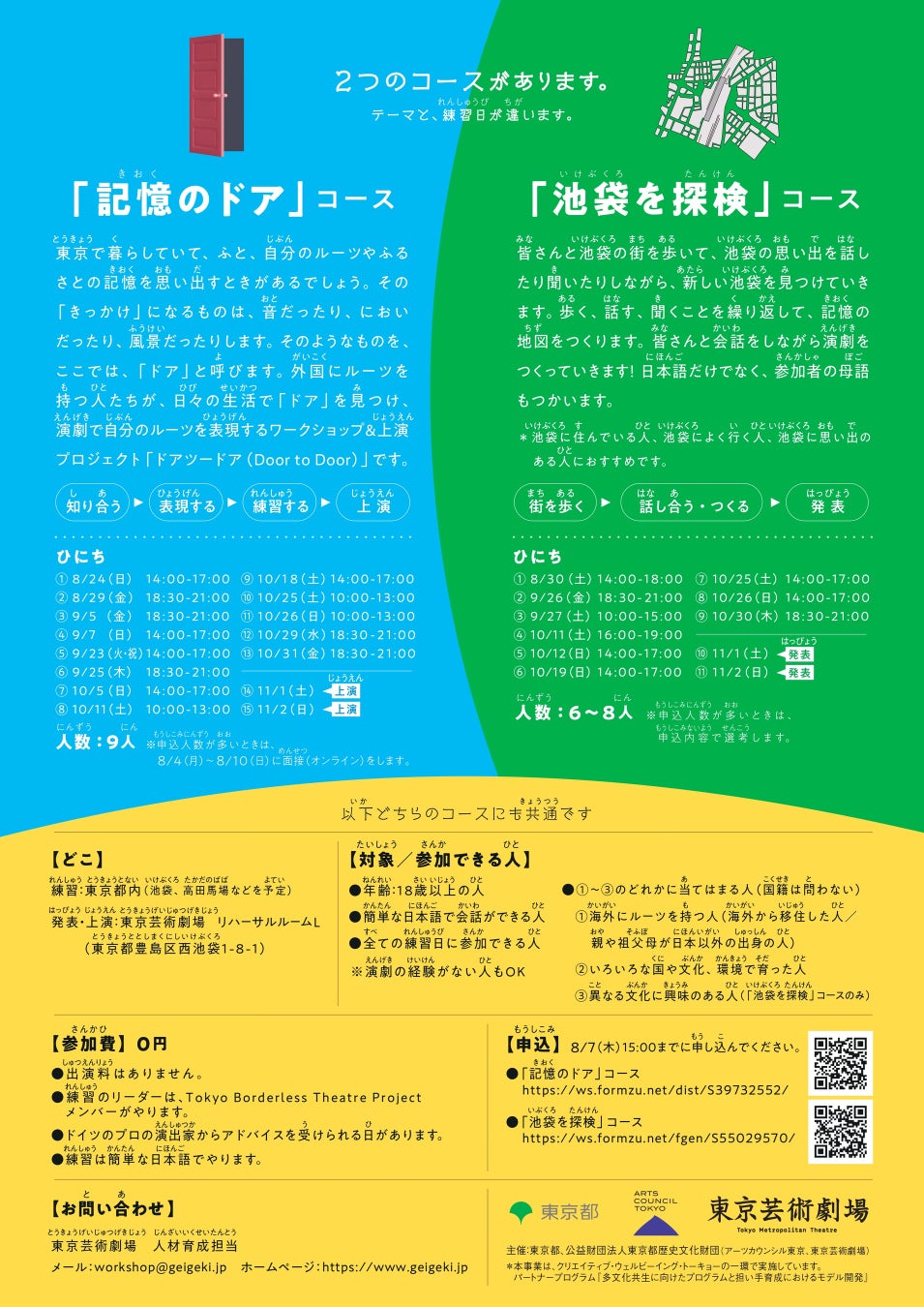 東京で暮らしていて、ふと、自分のルーツやふるさとの記憶を思い出すときがあるでしょう。その「きっかけ」になるものは、音だったり、においだったり、風景だったりします。そのようなものを、ここでは、「ドア」と呼びます。外国にルーツを持つ人たちが、日々の生活で「ドア」を見つけ、演劇で自分のルーツを表現するワークショップ&上演プロジェクト「ドアツードア(Door to Door)」です。