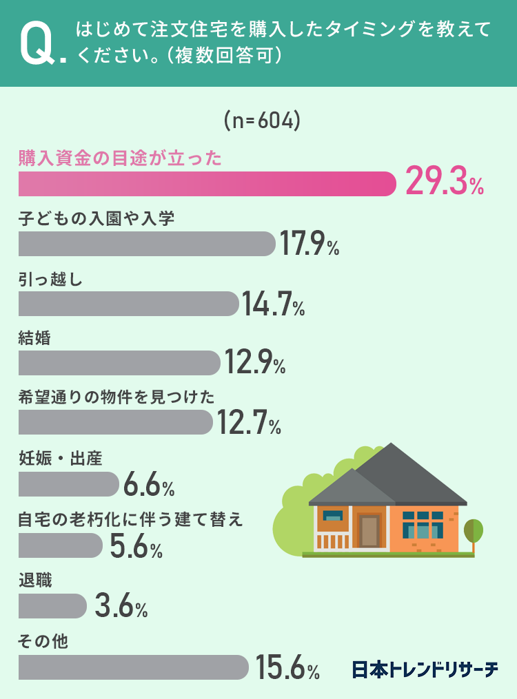 そこで今回は、注文住宅のナチュラルハウスと共同で、事前調査で「注文住宅を建てたことがある」と回答した全国の男女604名を対象に、「注文住宅の購入タイミング」についてアンケートを実施しました。