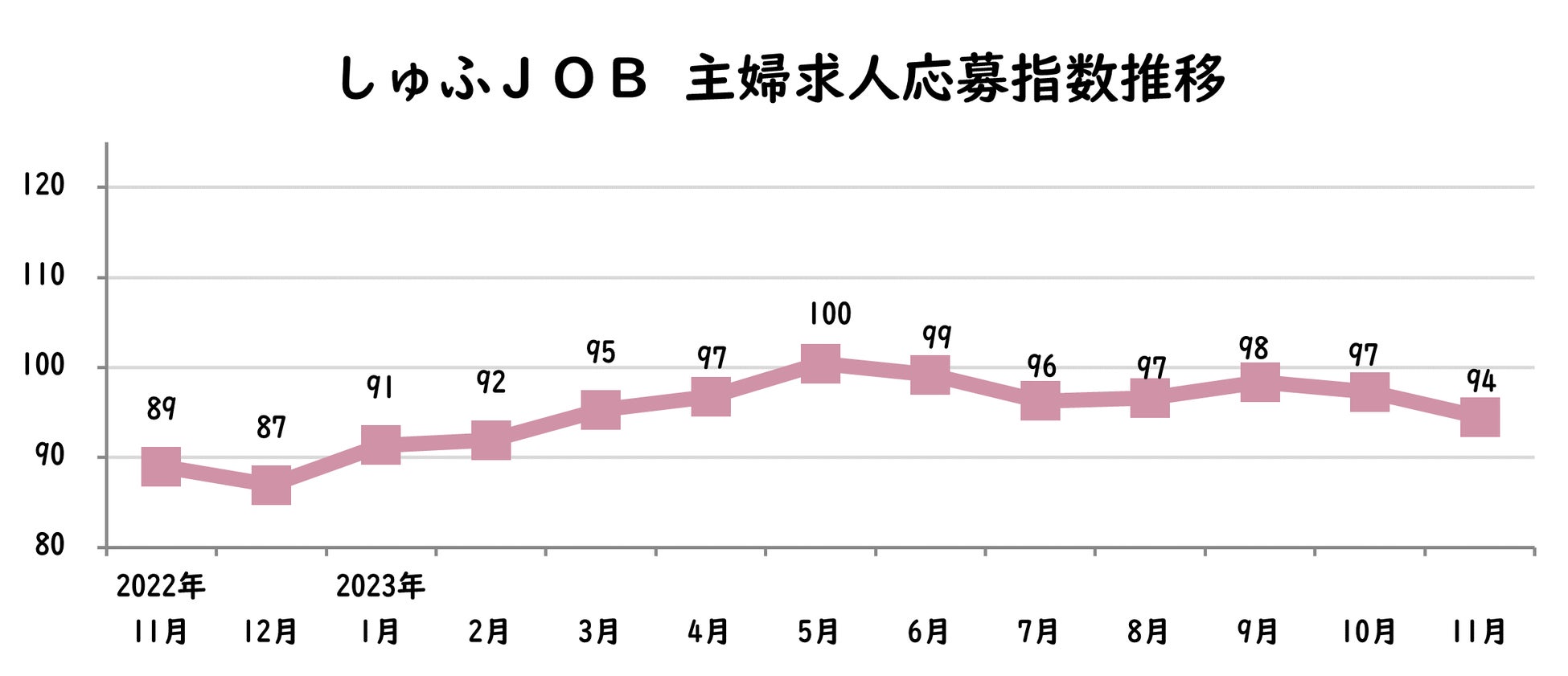 【しゅふの就職意欲調査 2023年11月】しゅふ求人の応募指数94(前年同月比+5)/飲食求人の応募指数上昇、賃上げ・時短化の影響か
