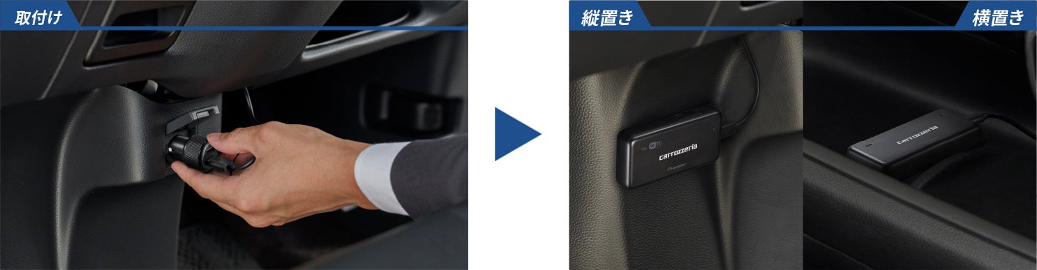 車のシガーソケットやUSBポートに接続※5するだけで、簡単に取り付けが可能です。コンパクトな本体で縦置き/横置きに対応しているので、設置場所を選ばず、他の車両への乗せ換えも簡単に行えます。USBポートが2系統(Type-A)のUSBシガーチャージャーを採用しており、お持ちのスマートフォンも同時に給電できます。