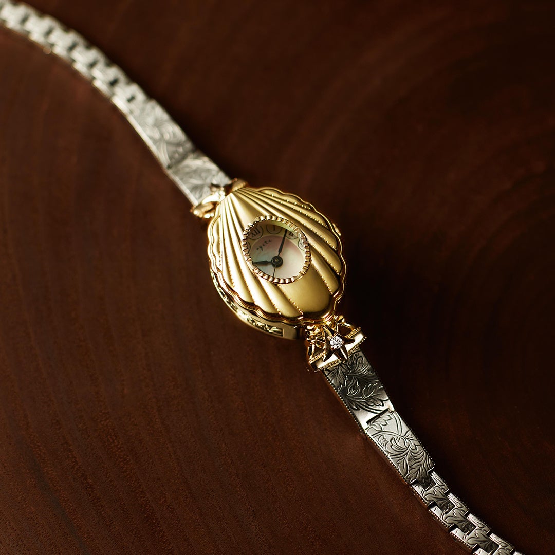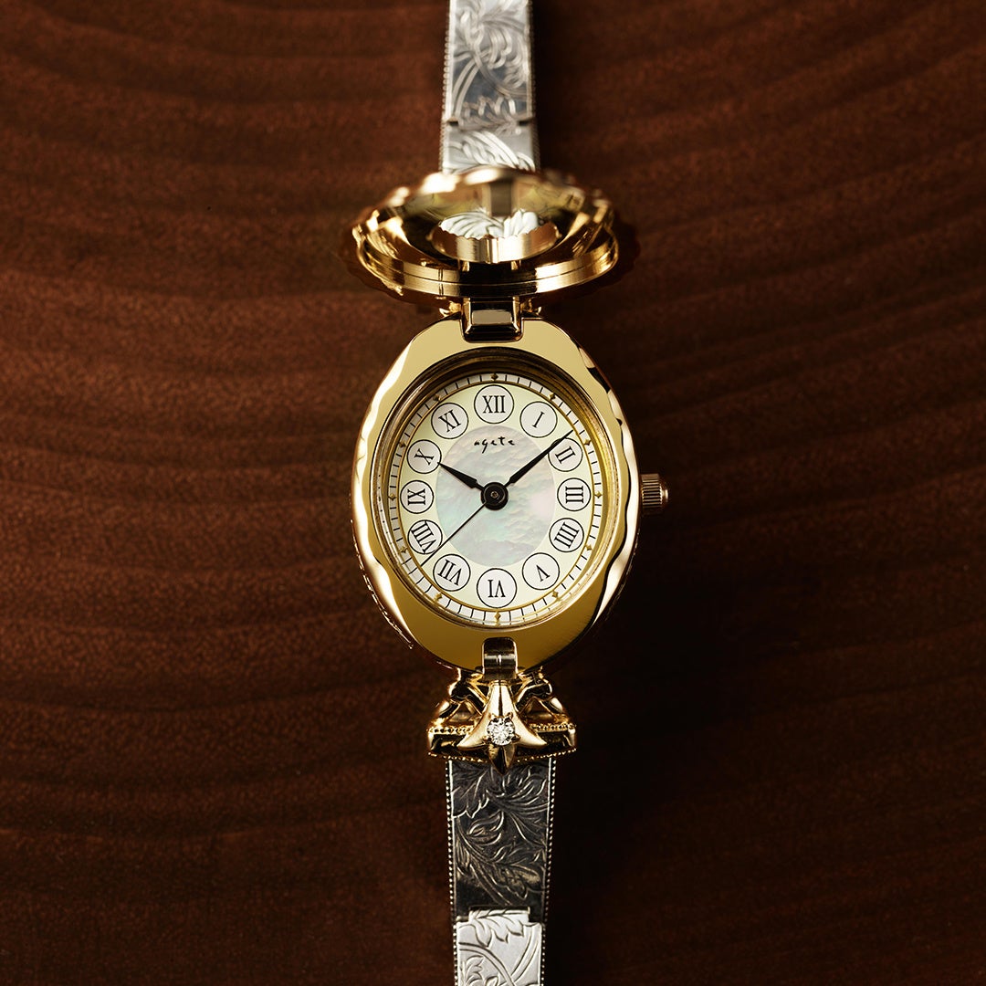 初めて登場した蓋付きタイプは、アガットのロゴマークでもあるシェルをイメージ。文字盤はクリームとホワイト、ブルーとホワイトのツートンカラーよりお選びいただけます。ローマ数字の雰囲気も相まって、他にはないこだわりのデザインに仕上がりました。シルバーのバンドには植物の彫り模様を施してアンティーク感をプラス。革ベルトも付いているので、その日のスタイリングに合わせて変えられます。