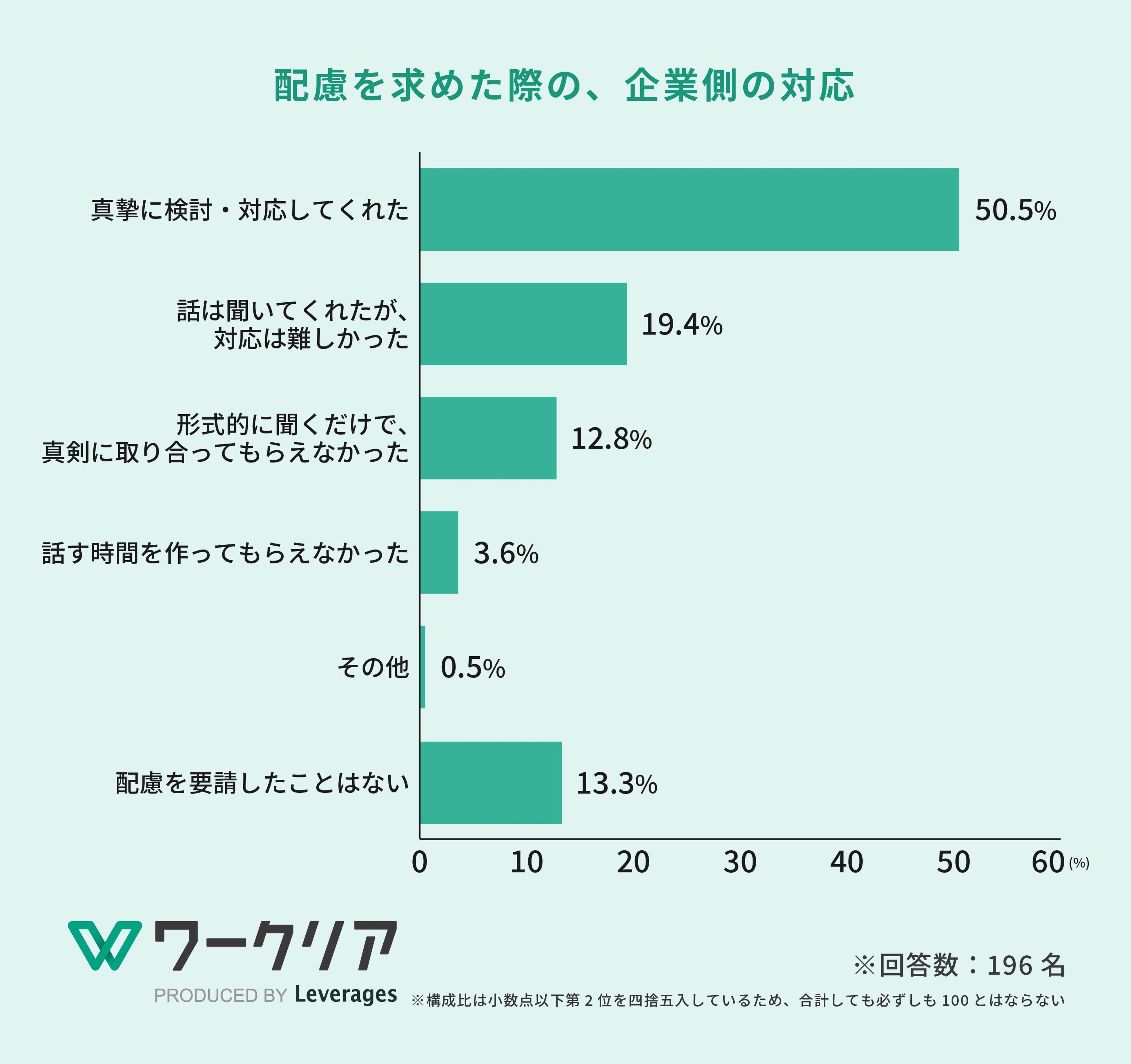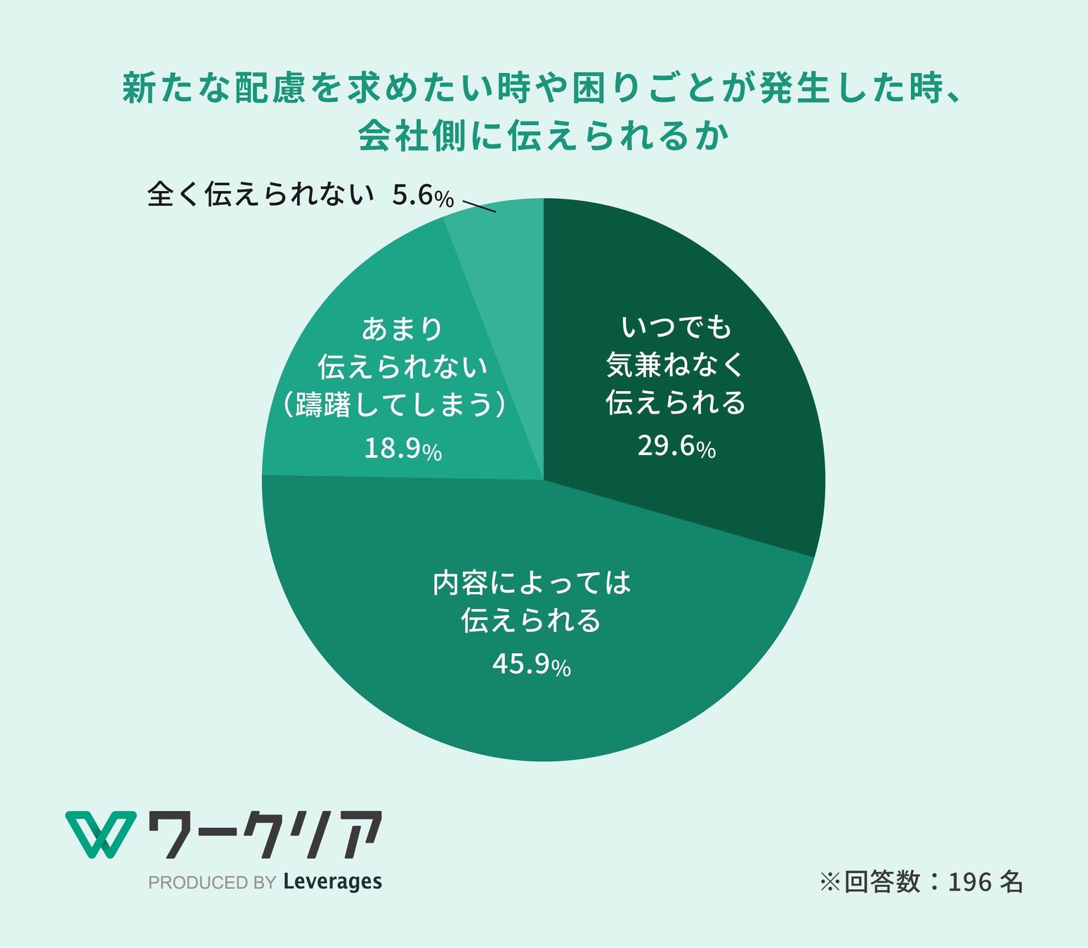レバレジーズ株式会社が運営する障がい者就労支援サービス「ワークリア」( https://worklear.jp/ )は、2016年4月に民間企業の雇用分野における「合理的配慮の義務化」から10年を迎えることを受け、会社員として勤務している障がい者196名を対象に、障がい者雇用における合理的配慮に関する実態調査を実施しました。