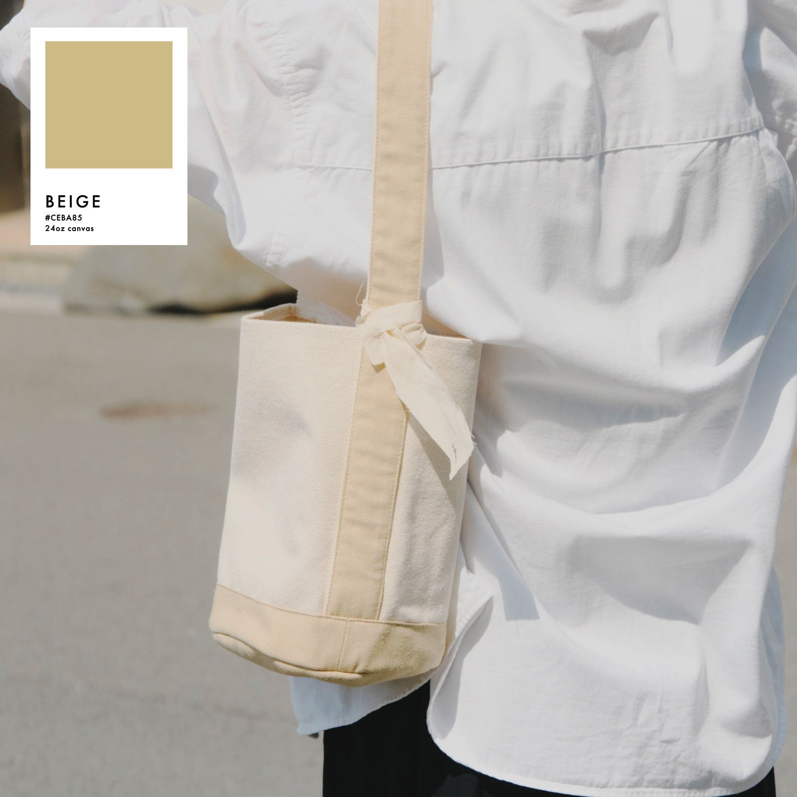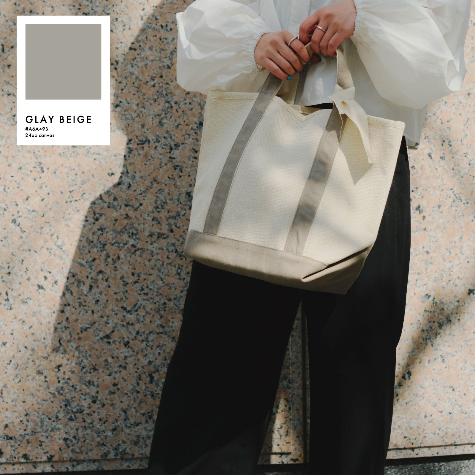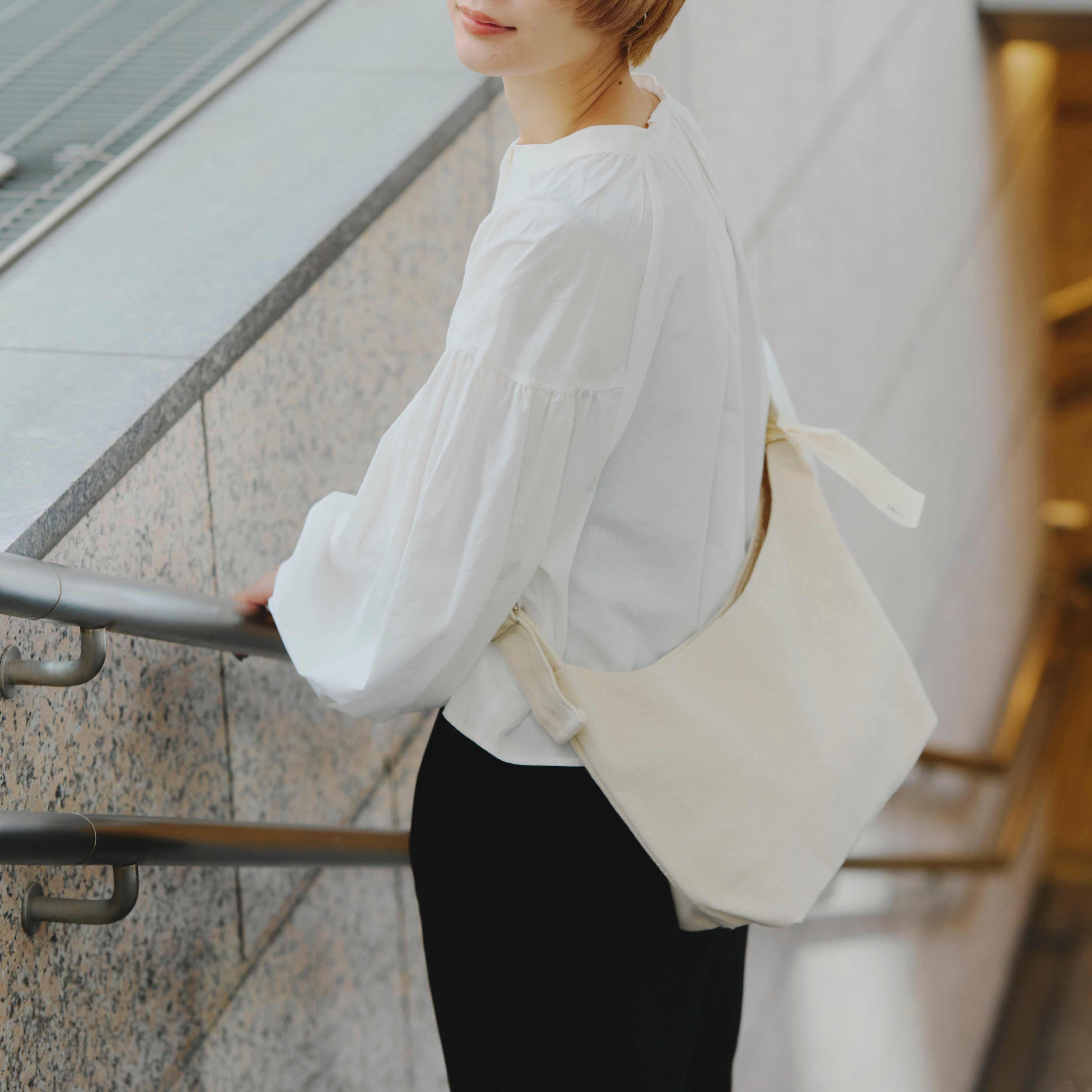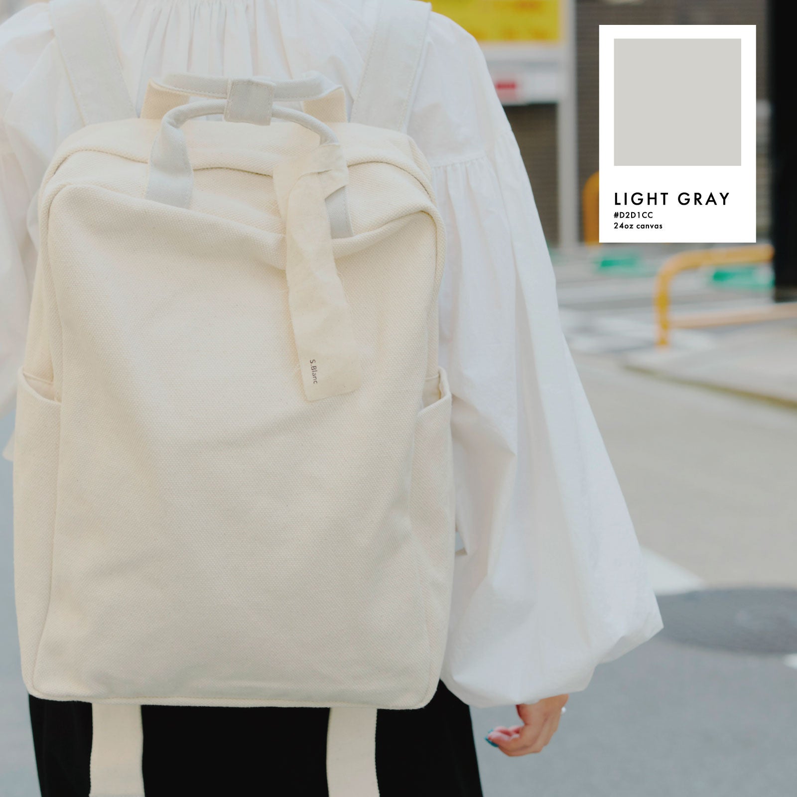 白いキャンバス生地×カラーの組み合わせで狙いすぎてない少し抜け感のあるスタイリングに。