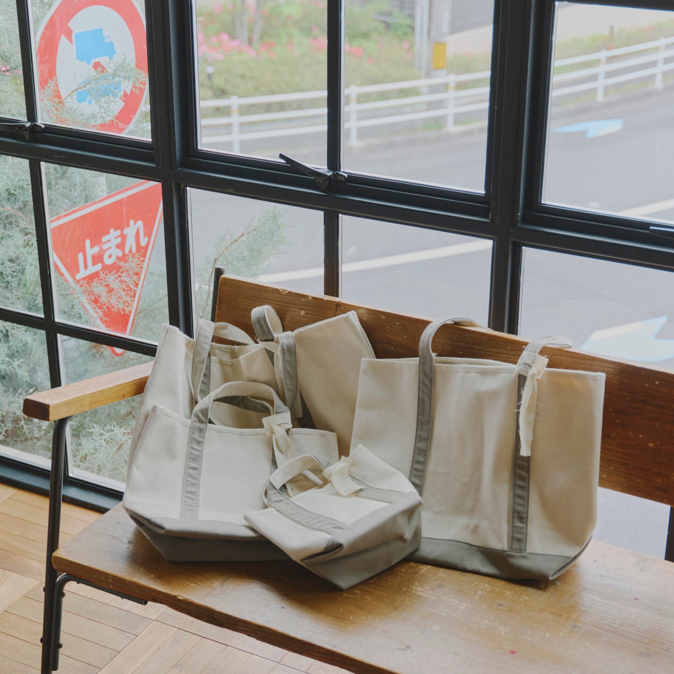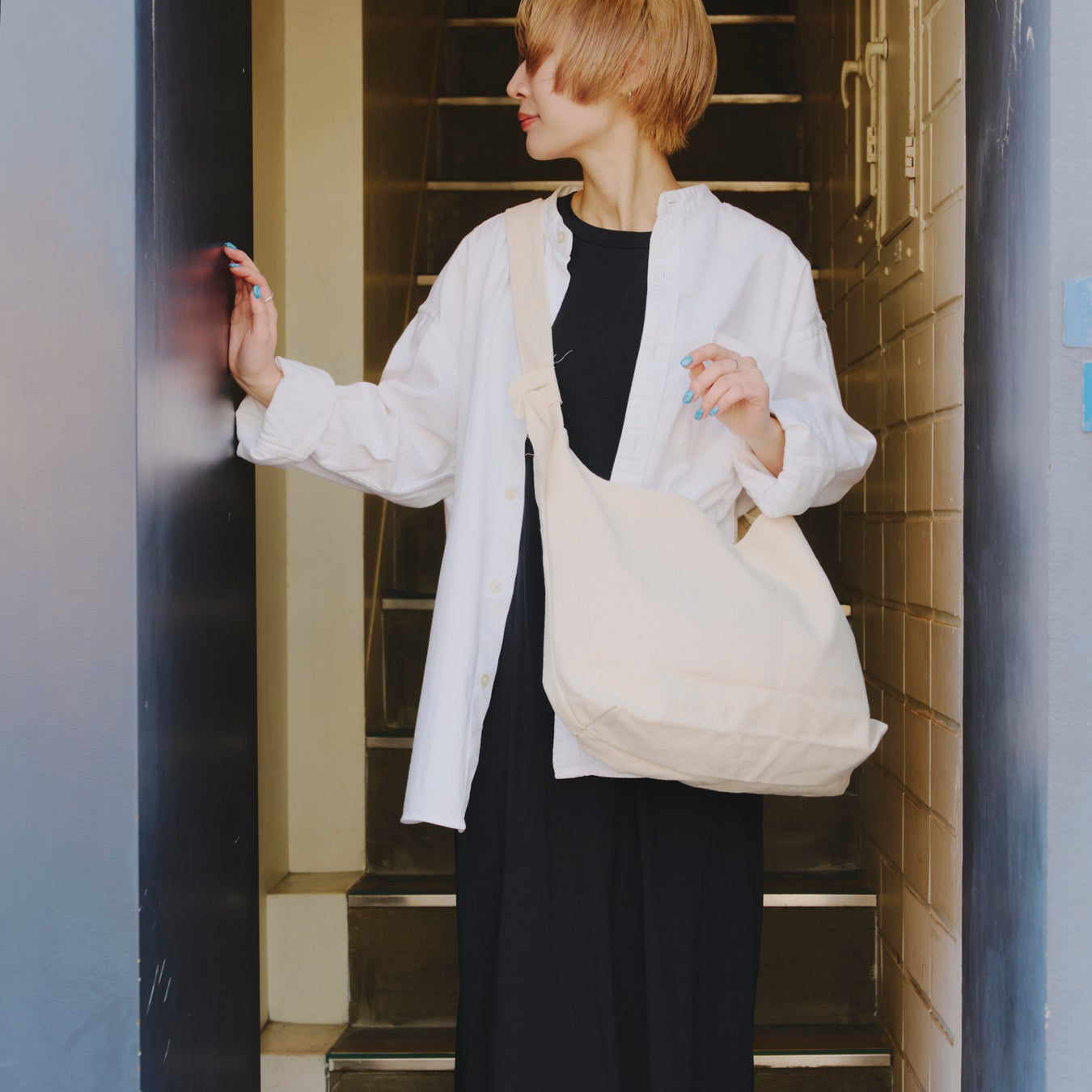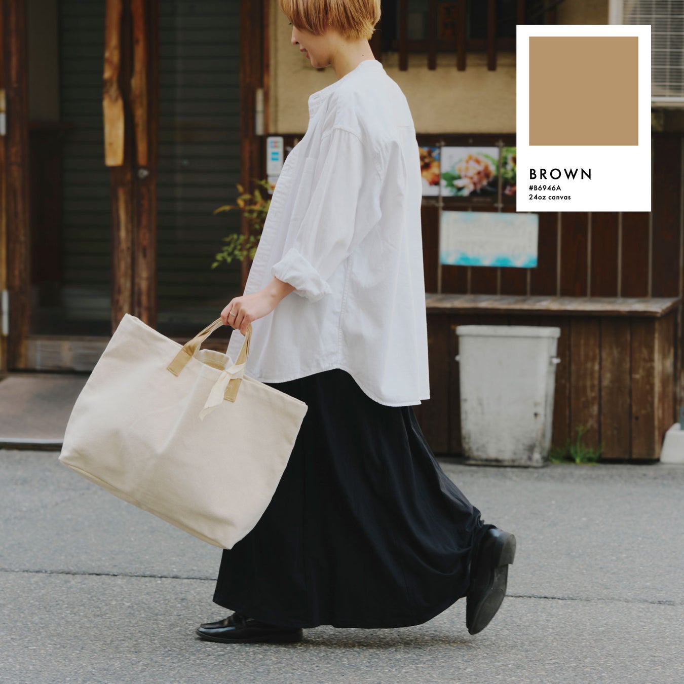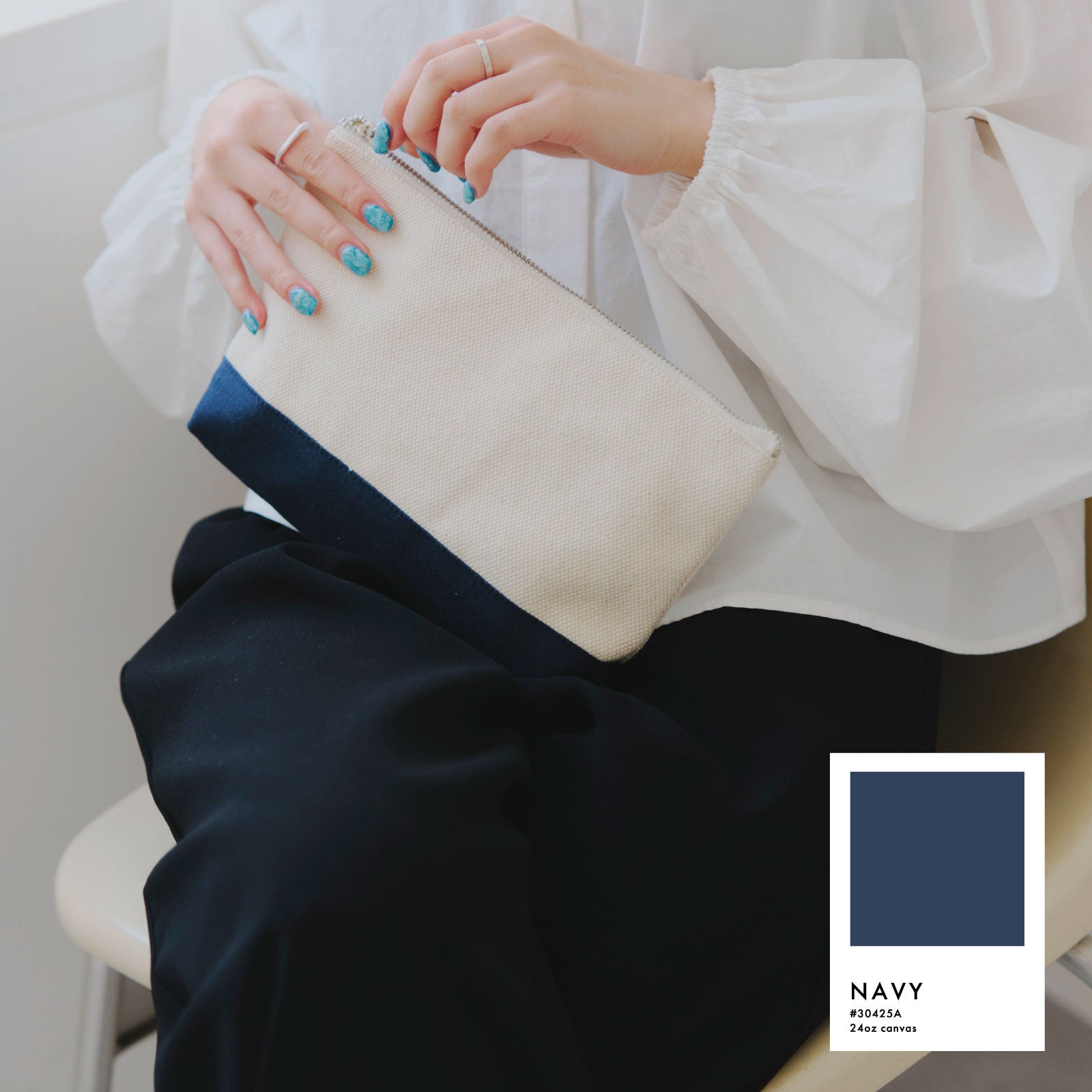 白いキャンバス生地×カラーの組み合わせで狙いすぎてない少し抜け感のあるスタイリングに。