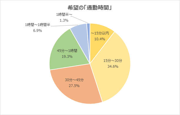 (1) 希望の通勤時間は「15分~30分」が34.6%で最多。次いで、「30分~45分」27.5%