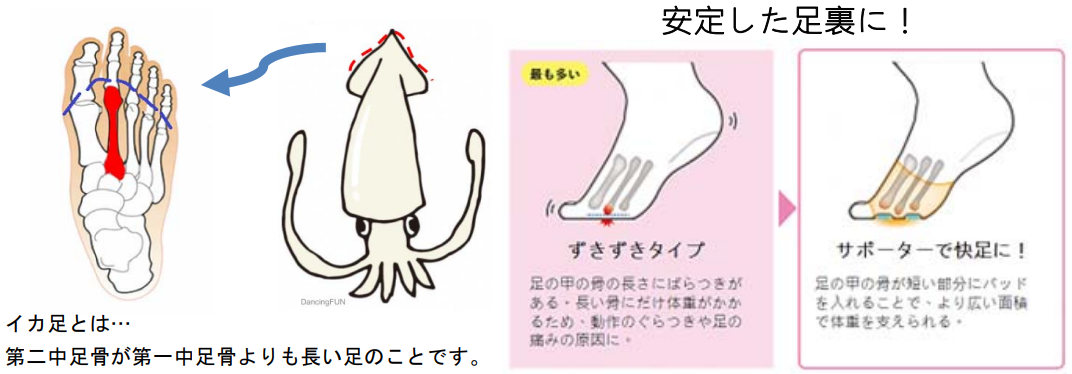 ダンシングファン株式会社は、足の甲の骨(中足骨)の短い部分に入れるイカ足サポーターを開発しました。