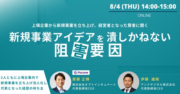 事業を創る仕組みを創る企業、株式会社オプトインキュベート(本社:東京都千代田区、代表取締役CEO:齋藤 正輝、以下、オプトインキュベート)は、アンドデジタル株式会社(本社:東京都文京区、代表取締役CEO:伊藤 雄剛、以下、アンドデジタル)と共催で、本年8月4日(木)に新規事業担当者様向けの無料ウェビナー「新規事業アイデアを潰しかねない阻害要因とは~成功するPoC(概念実証)とMVP(顧客に価値を提供できる最小限のプロダクト)の考え方~」を開催することを、お知らせいたします。