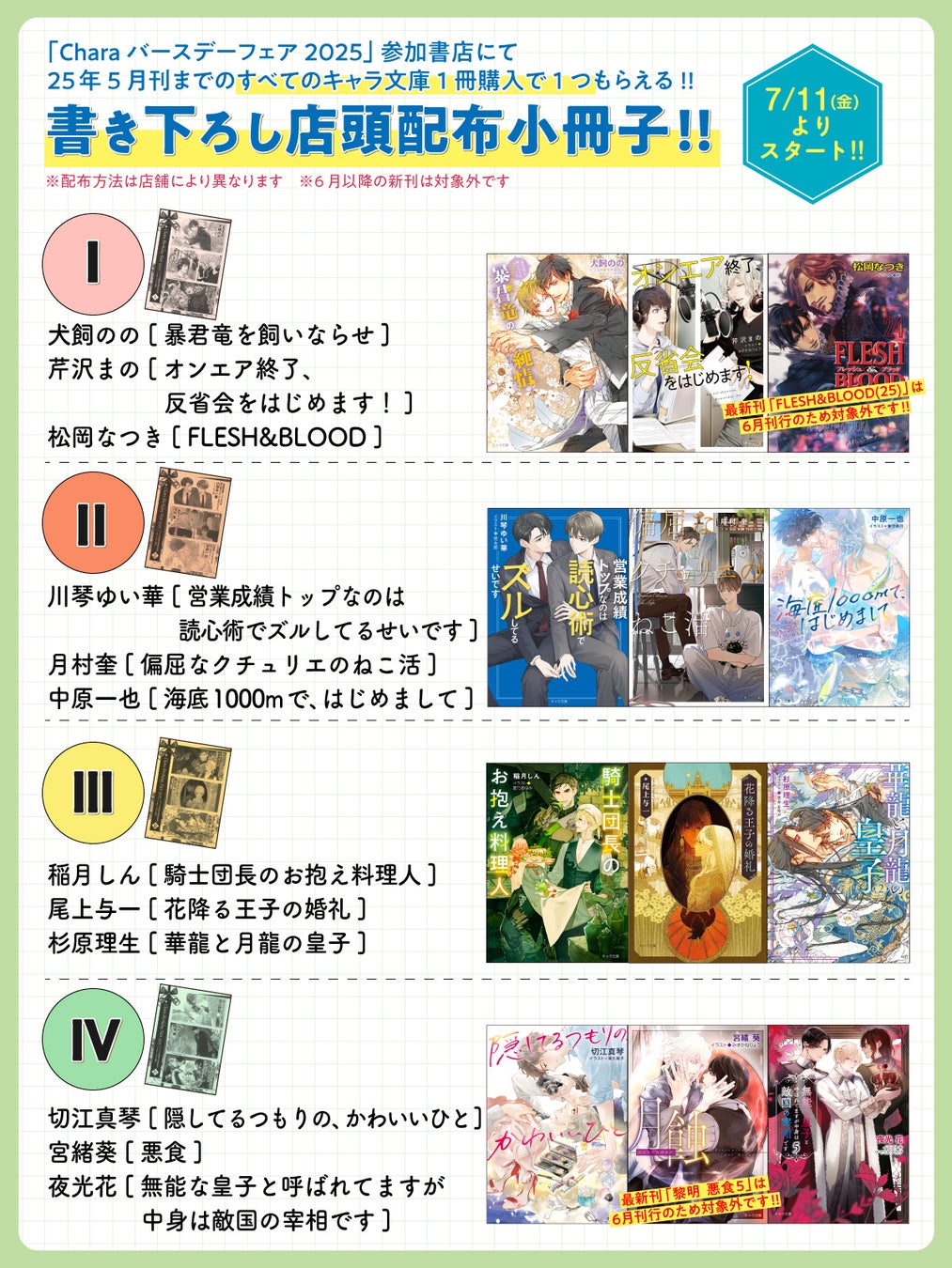フェア参加書店で25年5月までのCharaコミックス・キャラ文庫を購入すると、かき下ろし番外編集小冊子(店頭配布小冊子)をプレゼント!ここでしか読めないALLかき下ろし番外編を収録。