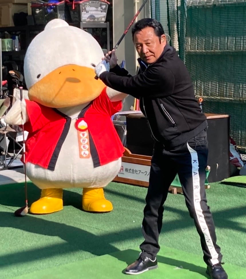 山本譲二 巣鴨のゆるキャラ『すがもん』と新曲ヒットをかけた飛ばし屋対決開催!