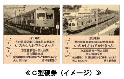 「井の頭線開業90周年 記念乗車券」は、グリーンの塗装を纏った1700形や1900形、旧1000系、その後井の頭線のイメージを形作ったレインボーカラーの3000系といった歴代の車両写真や、井の頭線90年のあゆみなどの紹介を記載した三面の台紙に「いのかしらおでかけきっぷ」C型硬券2枚をセットにしたもので、1セット1,000円(税込み)を、7月27日(木)正午から山口証券印刷専用サイト「きっぷと鉄こもの」で500セット先行販売、8月1日(火)から京王線・井の頭線の7駅において計2,500セット限定で発売します。