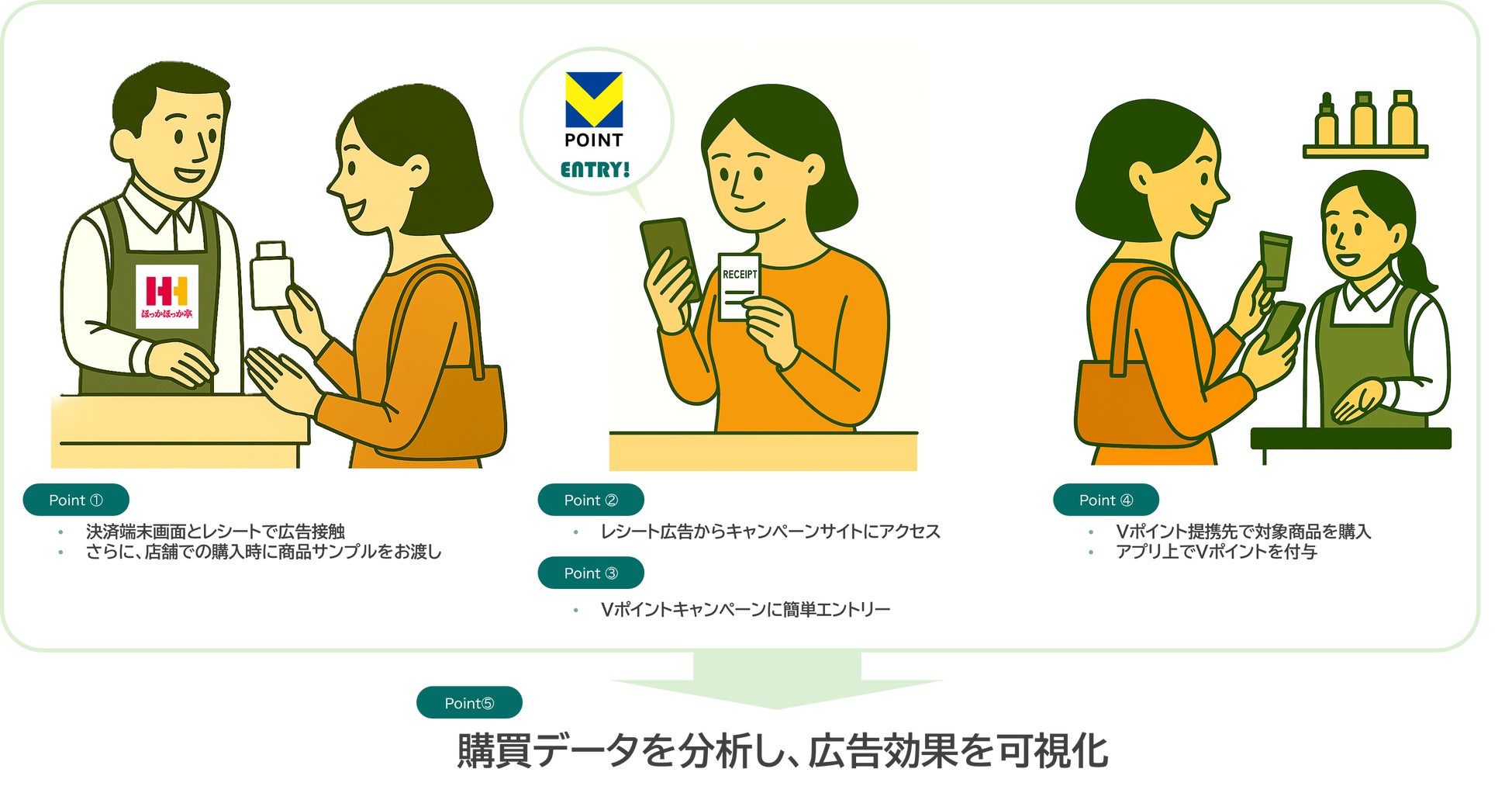 本施策は、「stera ads」を中心に、ほっかほっか亭が実施するメーカー商品のサンプリング施策や、CCCMKHDと三井住友カードが共同で提供するVポイントをインセンティブとしたエントリーキャンペーンを組み合わせ、「認知・体験・購買・効果検証」を一気通貫で実現するユニークな取り組みとなります。