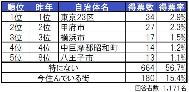 住みたい街のトップ3は2年連続で、1位東京23区、2位甲府市、3位横浜市。