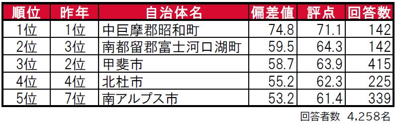 1位~4位の街は昨年と変わらず2年連続で同じ結果です。5位には昨年8位だった八王子市が順位を上げて新たにランクインしており、トップ5のうち3つの街は、山梨県外の自治体という結果になっています。