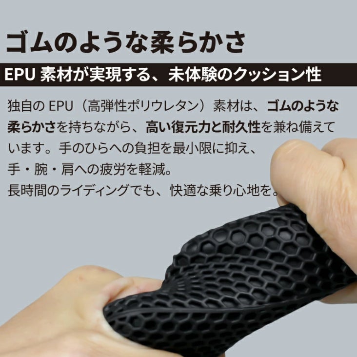 支え、圧力を均等に分散します。 これにより、長時間の走行で起こりがちな手のしびれや手首の痛み、疲労を大幅に抑制。 特にツーリングやクロスバイクでのロングライドに最適です。