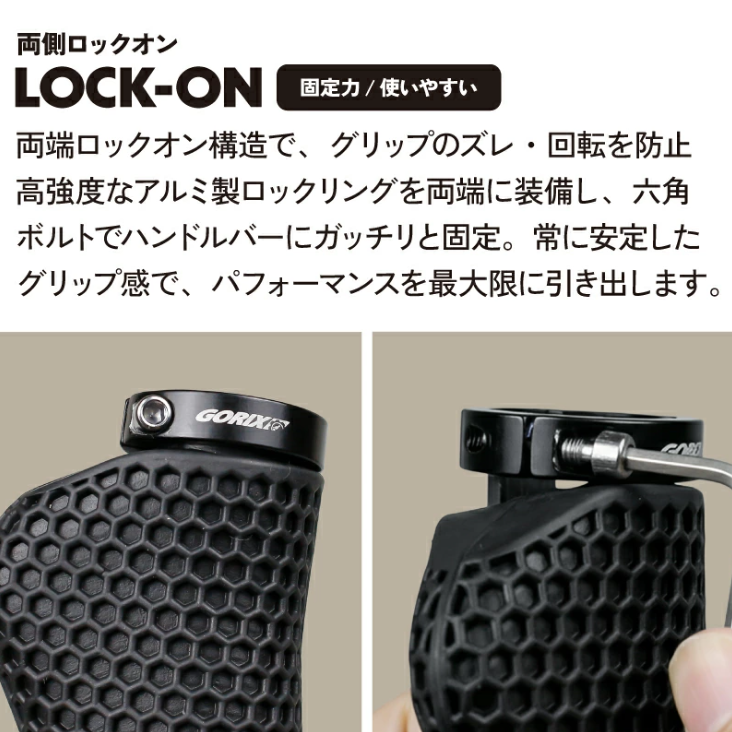 ●両端アルミロックオン構造で、走行中のグリップのズレ・回転を強力に防止