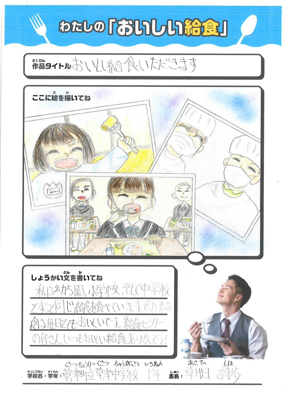 「私は幼稚園、小学校、そして中学校とずっと同じ給食を食べています。その給食は毎日とてもおいしいです。給食センターの皆さん、いつもおいしい給食ありがとう!」