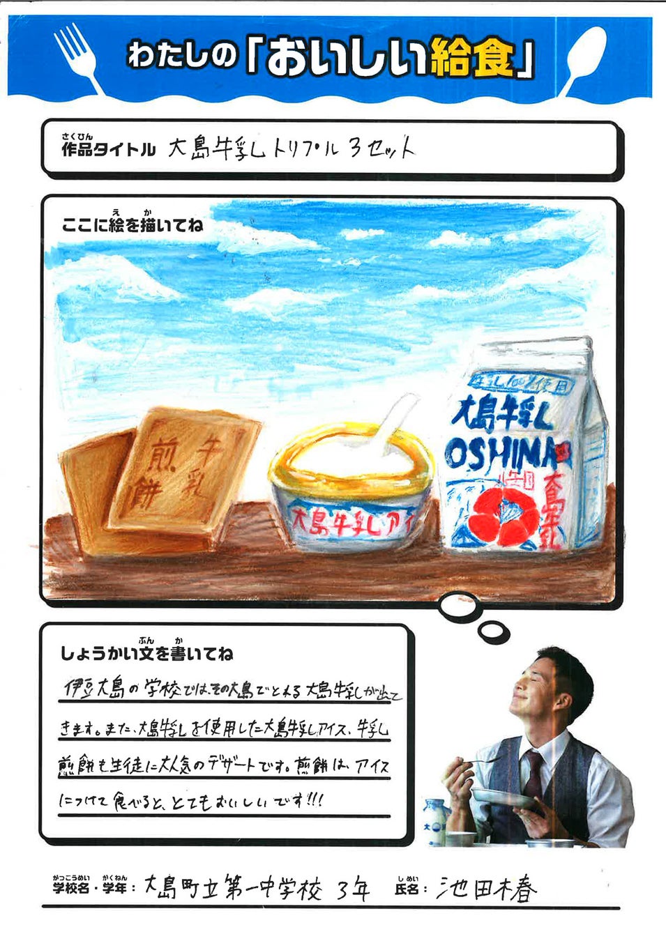 「伊豆大島の学校ではその大島でとれる大島牛乳が出てきます。また大島牛乳を使用した大島牛乳アイス、牛乳煎餅も生徒に大人気のデザートです。煎餅は、アイスにつけて食べると、とてもおいしいです!!!」