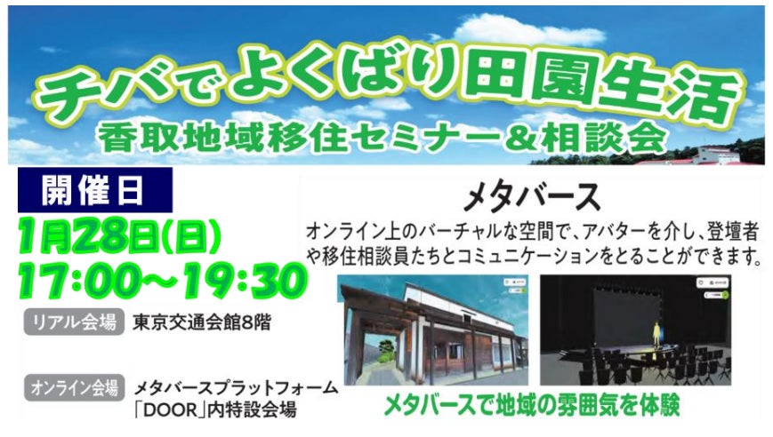 その取り組みの第一弾として、2024年1月28日(日)に、千葉県初の試みとしてメタバースを活用した移住相談会(主催:千葉県、香取市、神崎町、多古町、東庄町)を実施します。なお、NTT東日本では、本取り組みをweb版仮想空間プラットフォーム「DOOR※1」を活用して支援します。