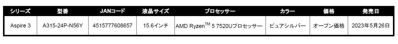 日本エイサー株式会社(本社:東京都新宿区、代表取締役社長:ボブ・セン)は、基本性能をおさえたスタンダードノートパソコン Aspire(アスパイア)シリーズより、Aspire 3の新モデル「A315-24P-N56Y」を本日2023年5月26日(金)に発売します。画面サイズは大画面の15.6インチ、解像度は鮮明に映し出すフルHDディスプレイ、CPUはAMD Ryzen™ 5 7520Uプロセッサーを搭載。動画視聴やブラウジングから簡単な写真編集といった用途をシンプルに1台で使いこなしたい方におすすめの新モデルです。なお、本製品は価格.com限定モデルとして販売します。