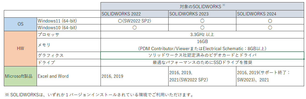 ・動作環境は、以下の対象となるSOLIDWORKSに準拠します。
