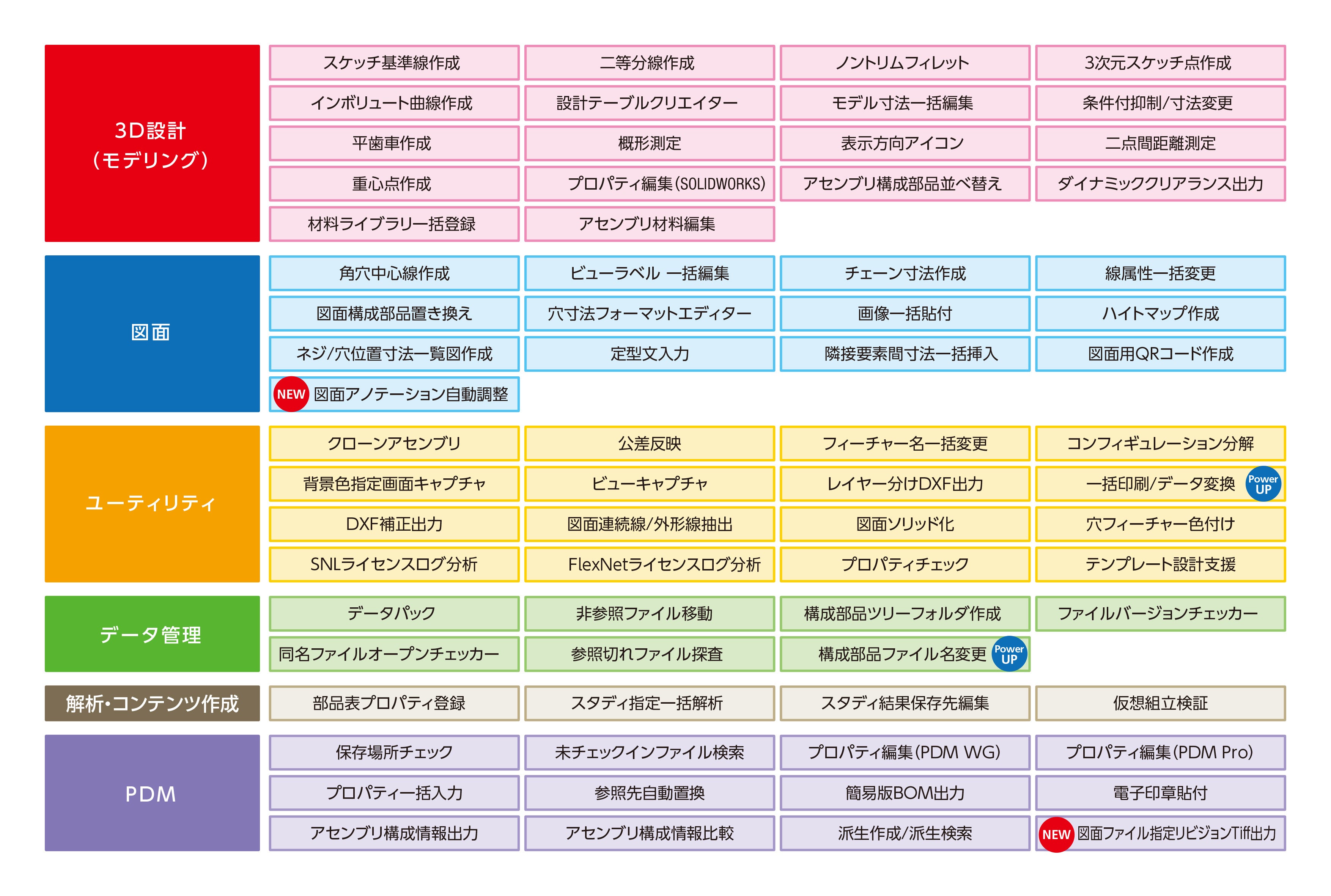 設計から生産にいたるさまざまな現場に対応し、3D設計(モデリング)、図面、ユーティリティ、データ管理、解析/コンテンツ作成、PDMの6つのカテゴリ全70機能を有しています。