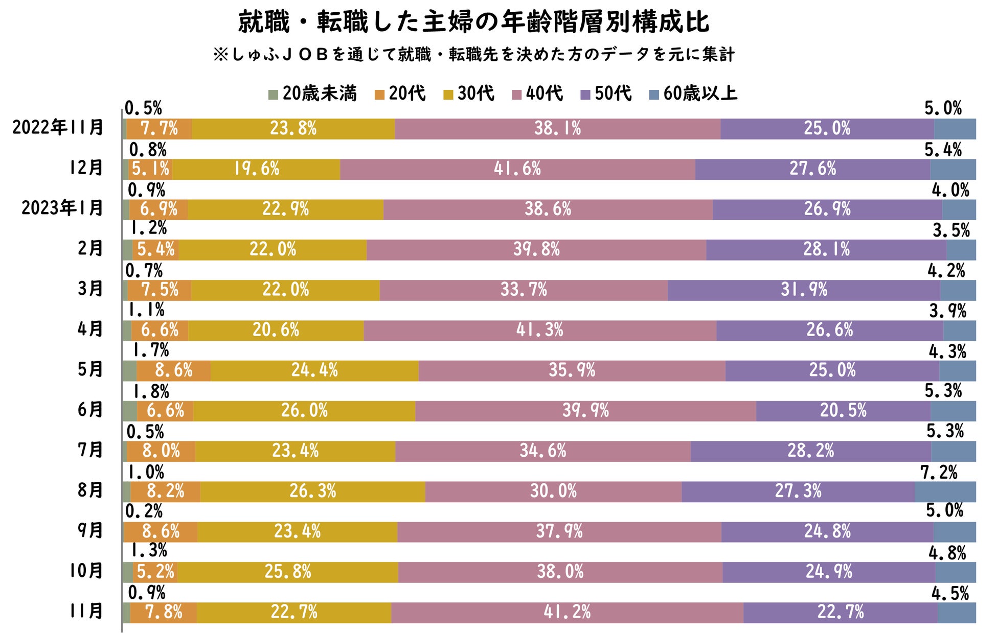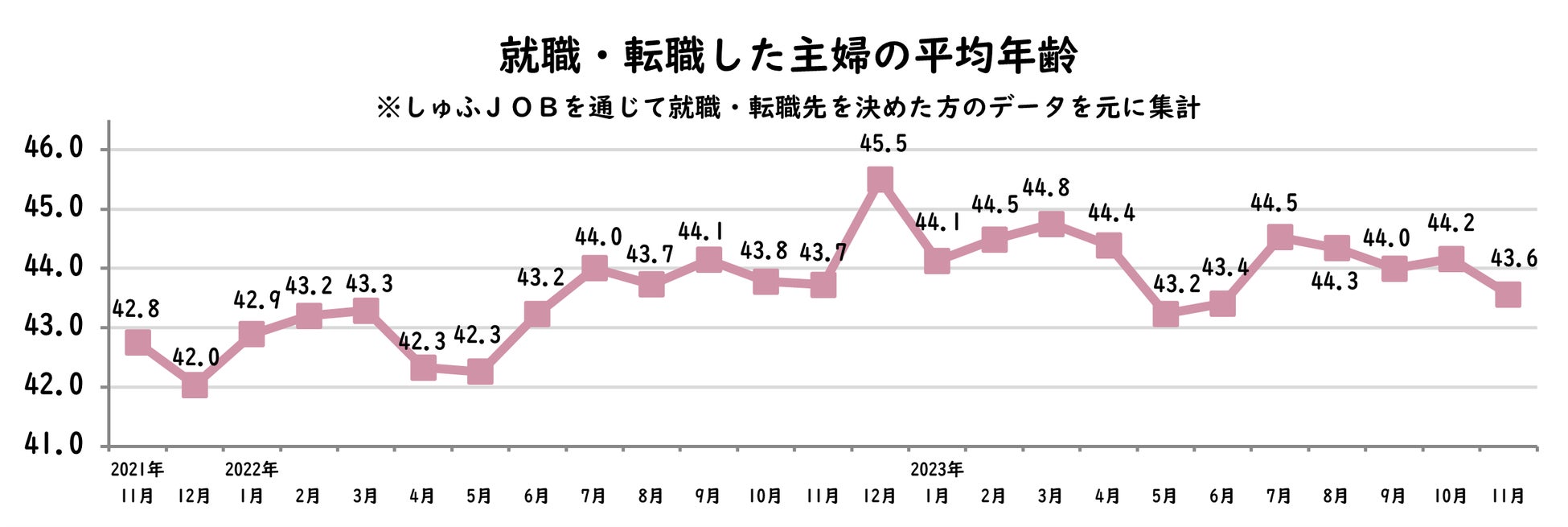 【転職しゅふの平均年齢調査 2023年11月】43.6歳(前年同月比-0.1歳)/子育て層の就職活動未だ活発、物価高の影響か