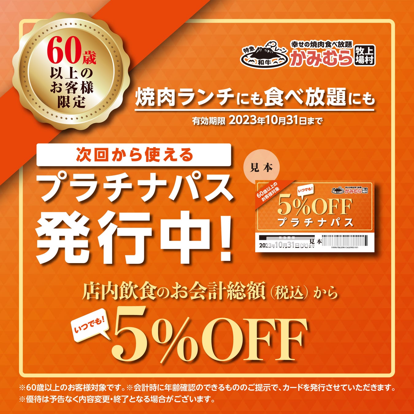 【かみむら牧場】60歳以上のお客様へ『プラチナパス』発行!焼肉ランチセットにも!食べ放題にも!何度もつかえる5%割引