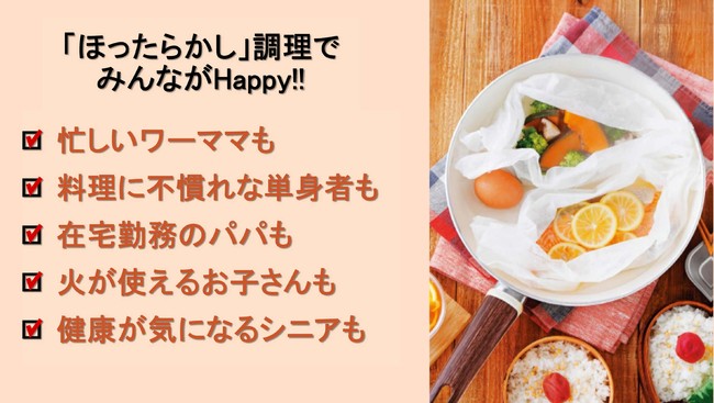 ①ハサミで食材を切る ②クッキングシートで包む ③フライパンで8分蒸すだけ の超カンタン3ステップで2品が同時に完成する、お手軽調理法。TV番組や各メディアでも取り上げられ、大好評を得ています。