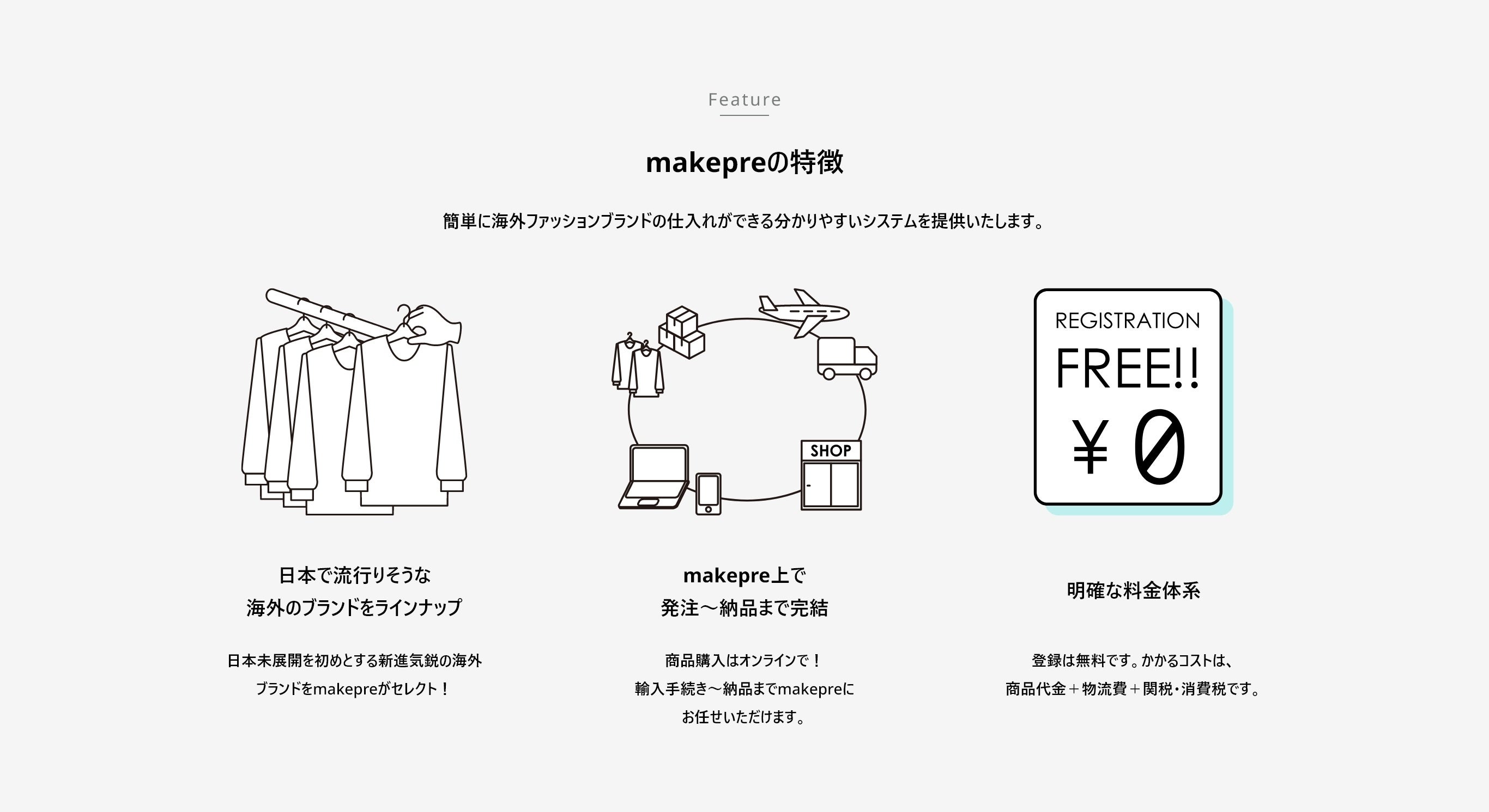 当社は、「社内起業家育成制度」第9号案件として、海外ファッションブランドのB2B向けオンライン卸売プラットフォーム「makepre」(読み方:マケプレ)(以下、本サービス)を開始します。本サービスは、海外ファッションブランド(以下、海外ブランド)のアパレル、バッグ、シューズなどの仕入れをECサイト上で実施することができる、日本のバイヤー向けのオンライン卸売プラットフォームサービスです。