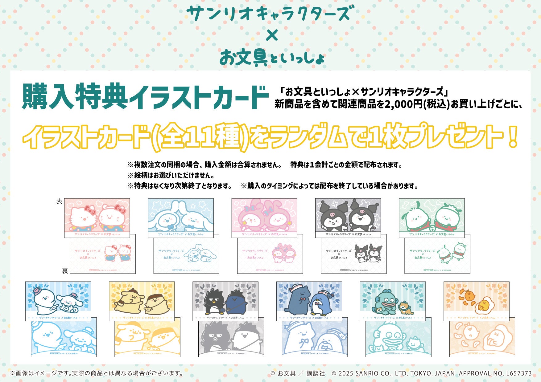 「お文具といっしょ×サンリオキャラクターズ」新商品を含めて関連商品を1会計2,000円(税込)お買い上げごとに、購入特典としてイラストカード(全11種)をランダムで1枚プレゼントします。