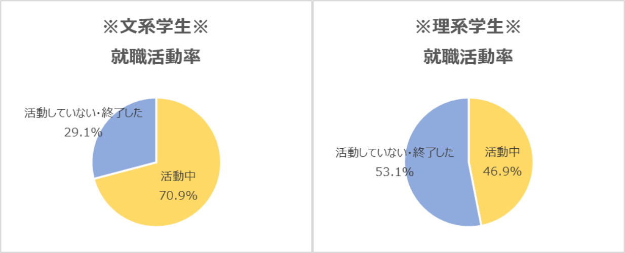(2) 現在の就職活動率は、前月比11.3ポイント減。一方、文系は約7割が継続中