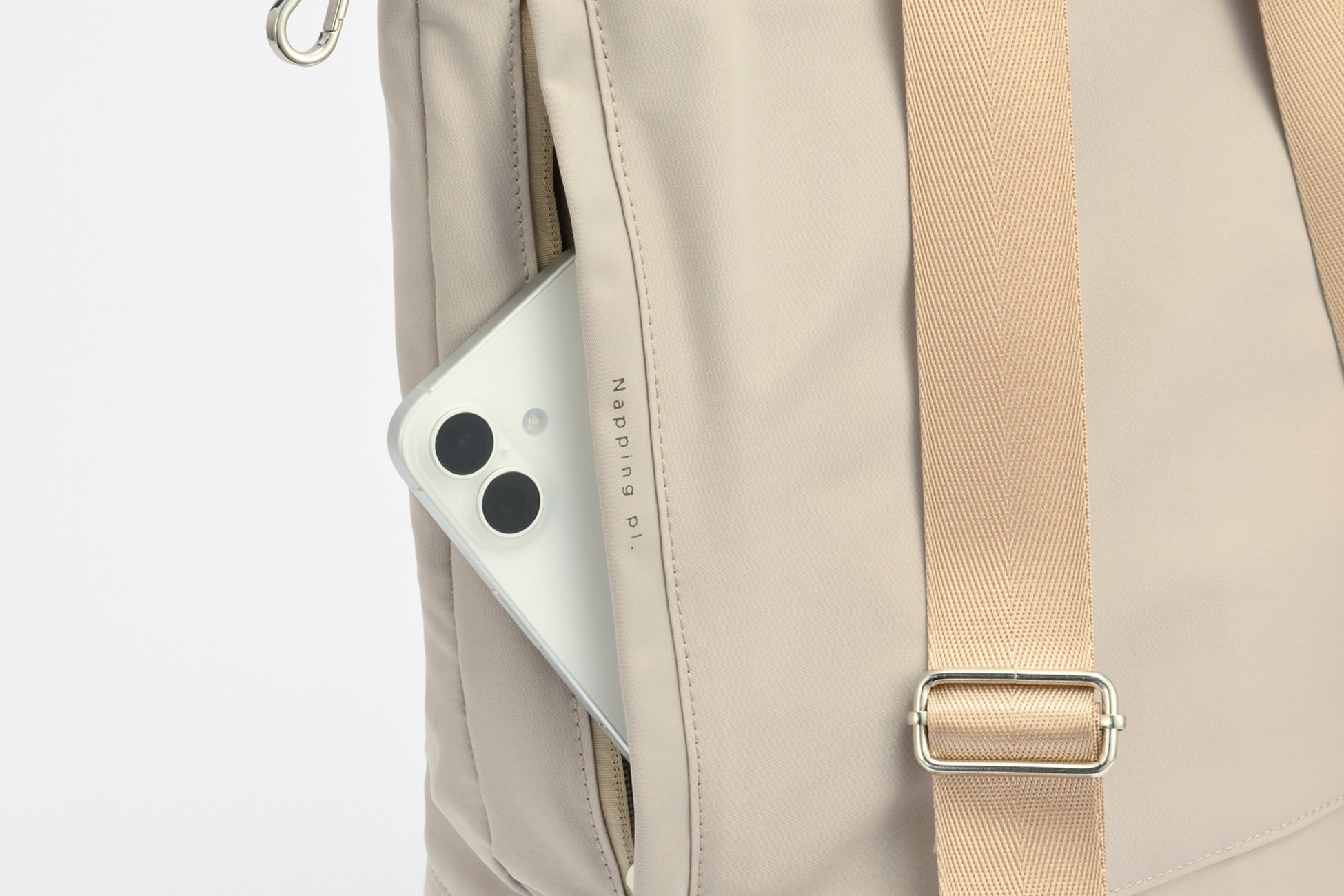 洋服のポケットのような感覚でスマートフォンを出し入れできるポケット「napping pl.(ナッピングプレイス)」を配置。ポケット内装には、柔らかいスエード調素材を採用し、使用頻度の高いスマートフォンを優しく保護します。