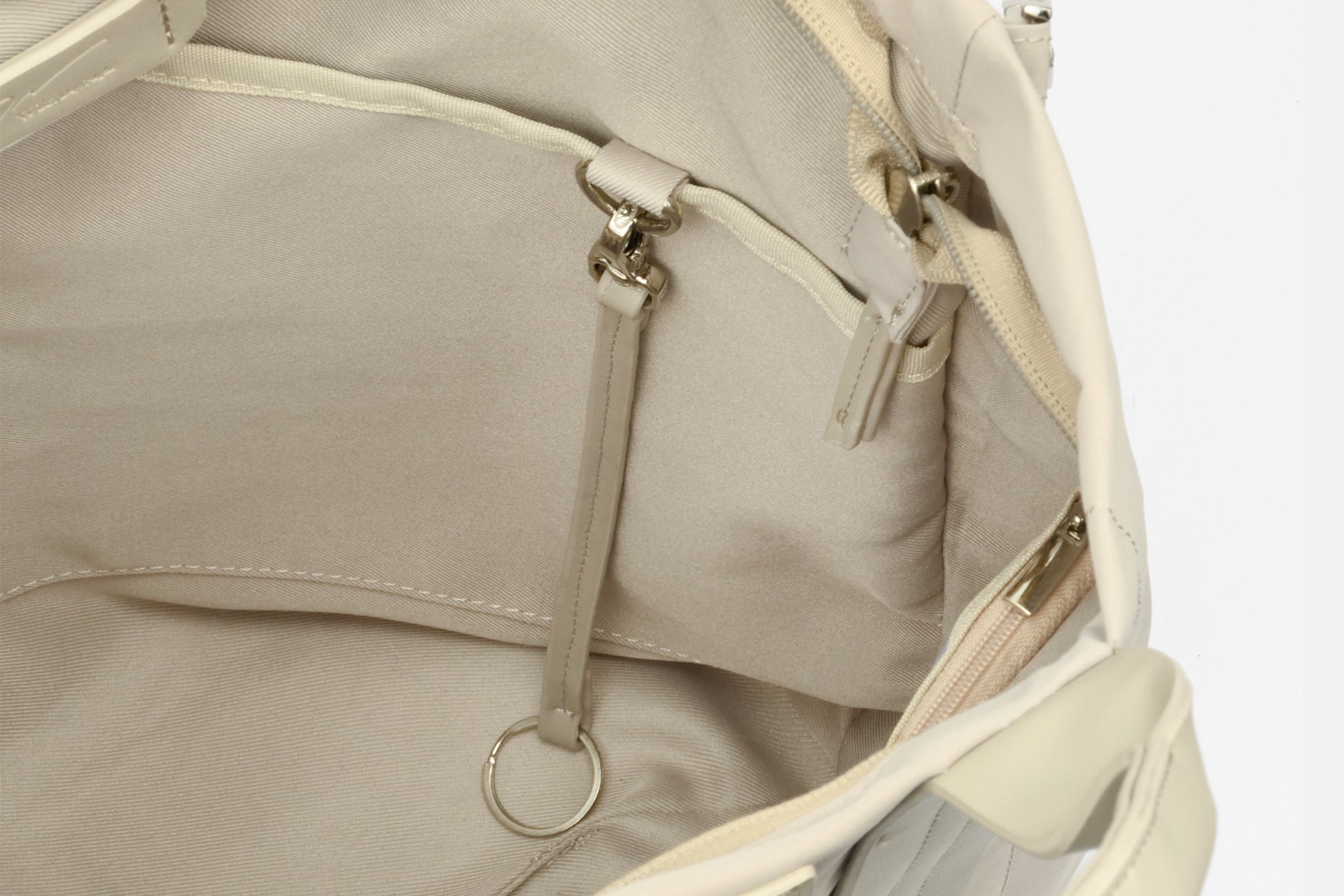 鍵やパスケースなどの小物をフックで繋げておけるキーストラップが付属。バッグ内には、複数のDカンを配置しているので、収納スタイルに合わせてお好みの位置に取り付けることができます。