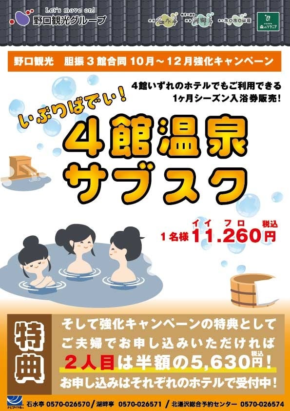 胆振管内にある野口観光のホテル「石水亭」、「湖畔亭」、「ホロホロ山荘」、「森のソラニワ」にて、いずれもご利用できる一ヶ月シーズン日帰り入浴券を販売しました!10月~12月の強化キャンペーンでございます。