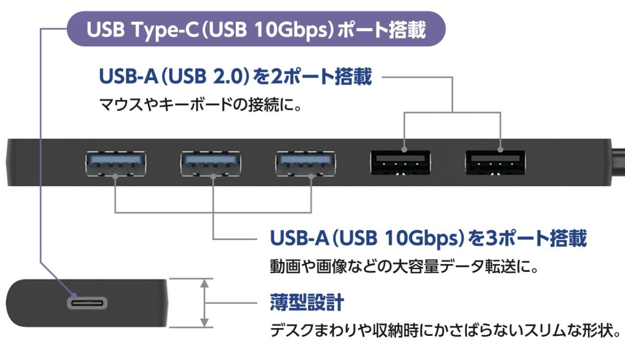 ■USB-A・USB Type-C(USB-C)ポートを搭載したUSB Type-C(USB-C)プラグ接続のUSBハブです。ポートの少ないパソコンでも多様な周辺機器を接続できます。