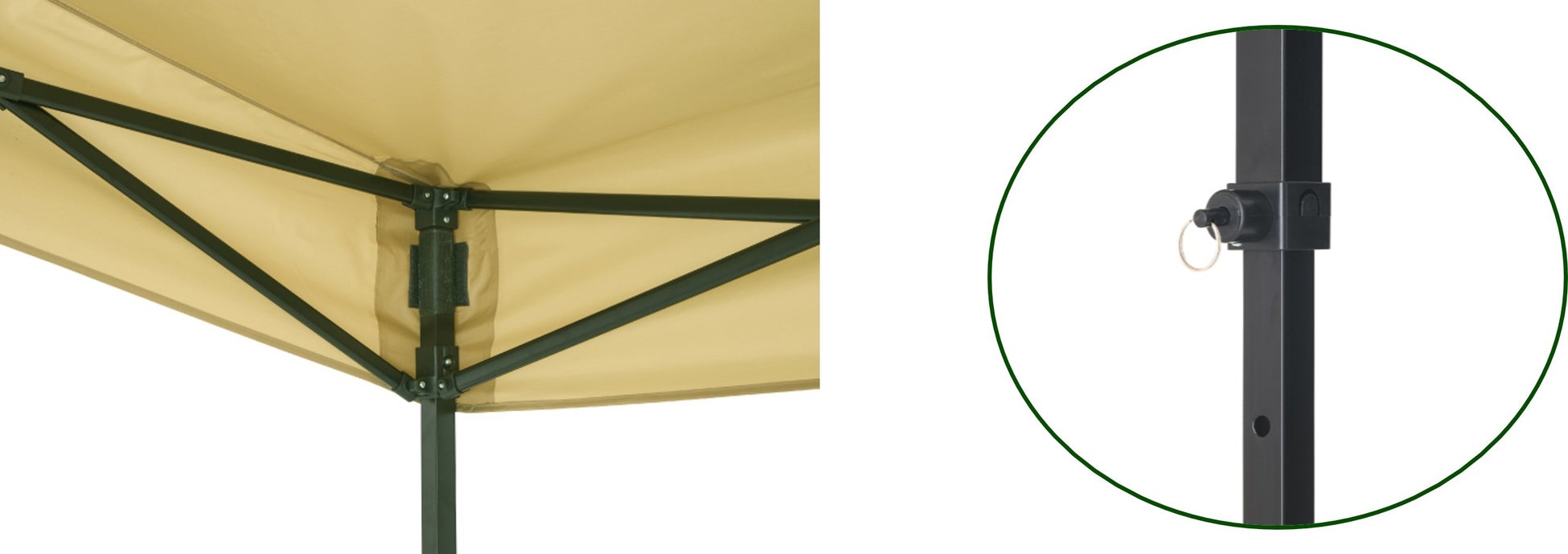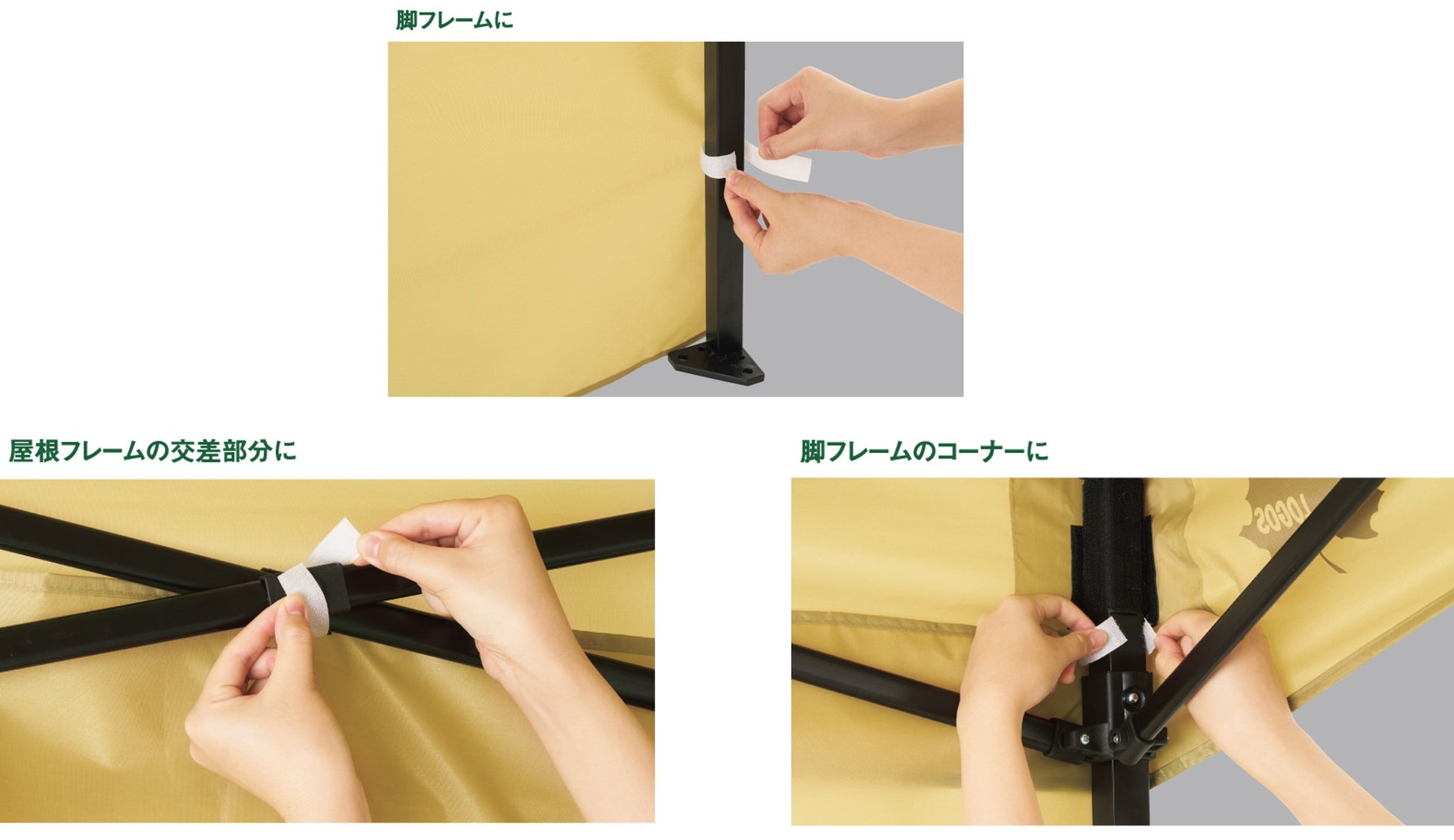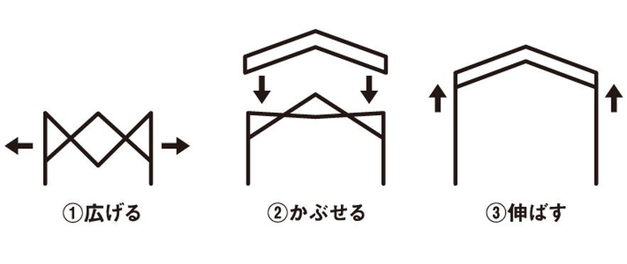 一体型フレームを採用しているため、フレームを広げて生地をかぶせ、留めるだけで簡単に設営が可能。組立て時間はわずか3分で、ネジや金具は、一切なし。