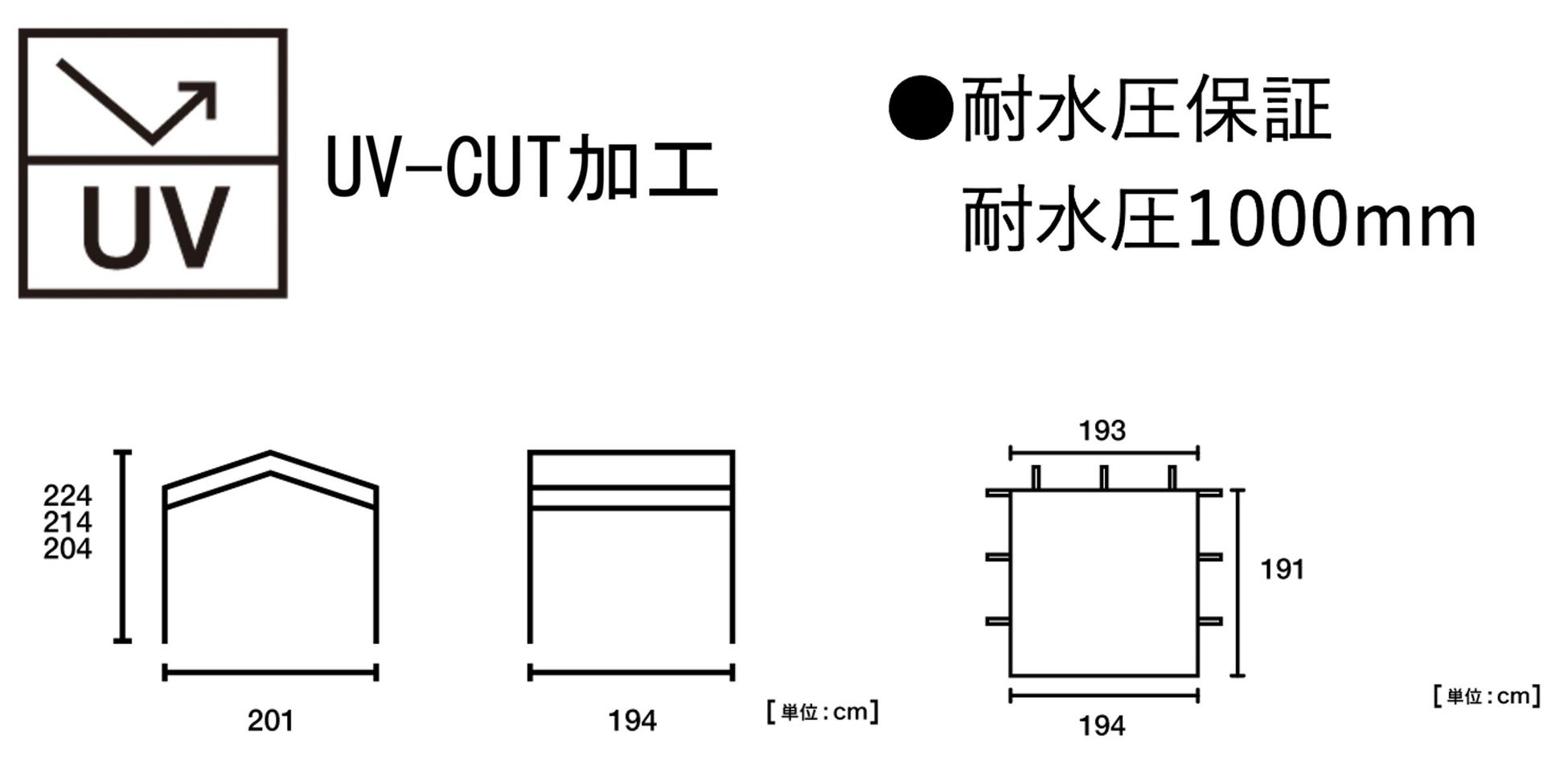 「切妻 Qセットタープ用サイドウォール」の生地は、UVカット加工により紫外線を約90%以上カット。「切妻 Qセットタープ用ソーラーブロックサイドウォール」は、UVカット率99.9%、遮光率100%を誇るソーラーブロック生地を採用し、日射しを遮り熱をやわらげ、夏場でも快適に過ごすことができる。両アイテムともに耐水圧1000mmで、雨の日でも安心して使用可能。