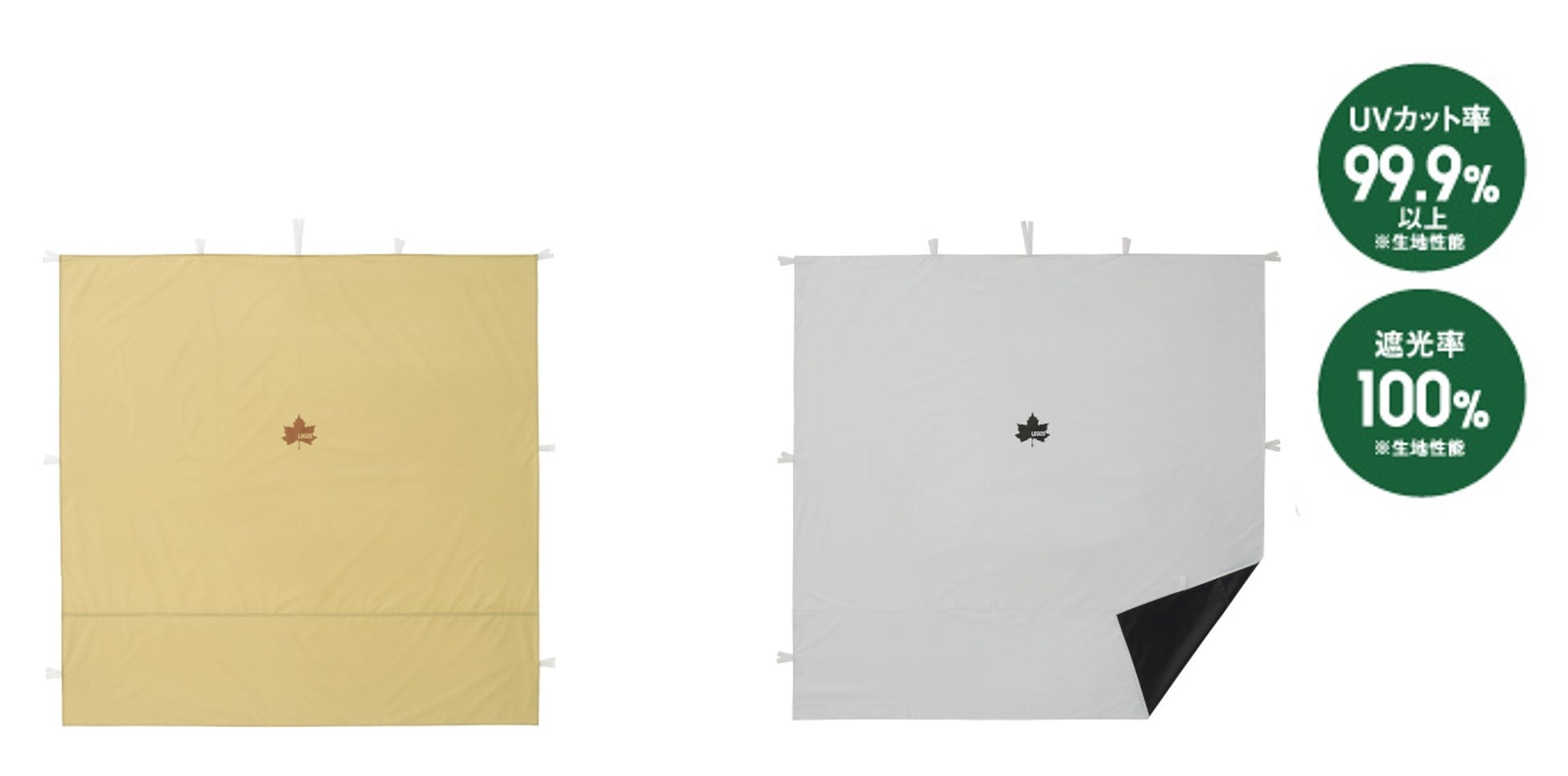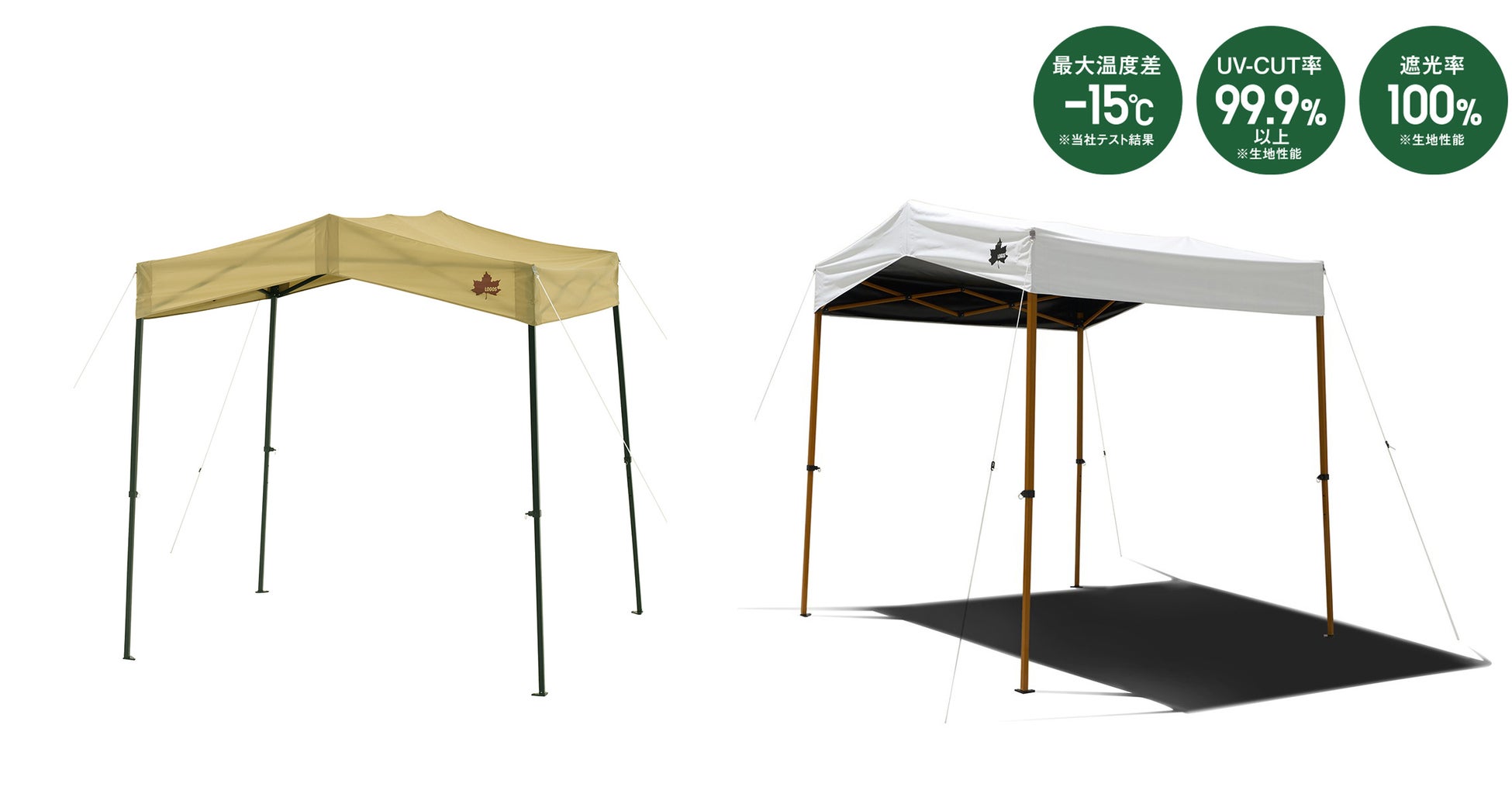 「切妻 Qセットタープ-BE」と「切妻 Qセットタープ用サイドウォール」はUVカット加工により紫外線を約90%以上カットします。また、「ソーラーブロック 切妻 Qセットタープ-BE」と「切妻 Qセットタープ用ソーラーブロックサイドウォール」は、ソーラーブロック加工を採用しているため、夏の炎天下でも安心のUV-CUT率99.9%、遮光率100%を実現しました。表側の白は太陽光と紫外線を反射させ、裏側の黒で熱を吸収するため、日陰と日向で最大15℃もの温度差を生みだします(※LOGOS調べ)。