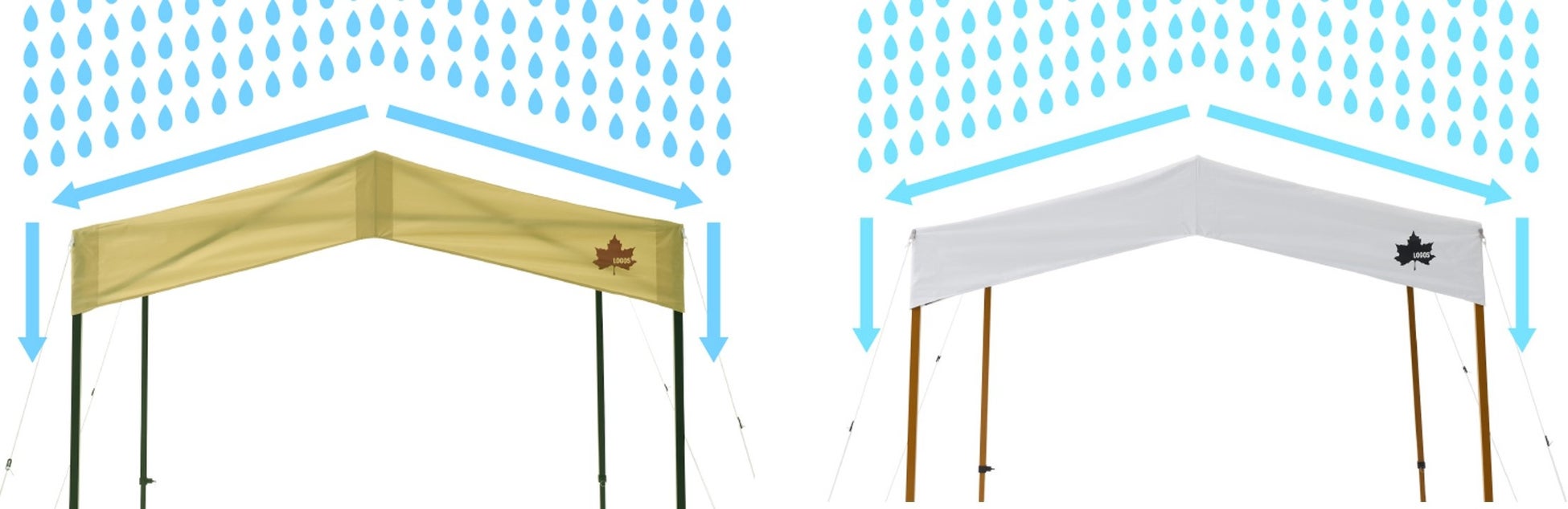 屋根の頭部から、両側に傾斜した形状が特徴の「切妻屋根」を採用。雨天時は雨水が左右へ流れる構造のため、前後の入り口への雨だれを軽減する。出入りする際に濡れにくいので、野外イベントでの受付などの利用もおすすめ。