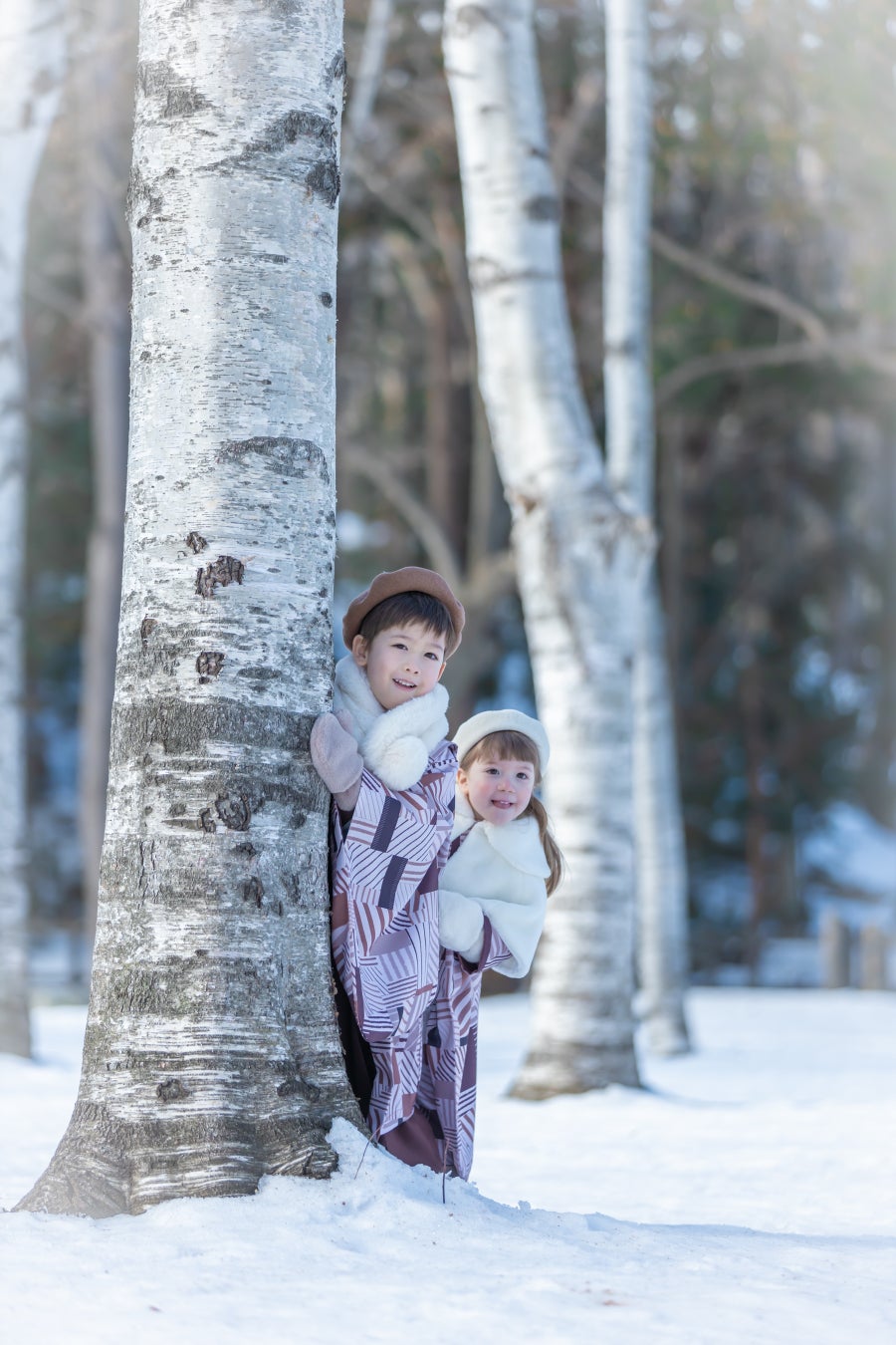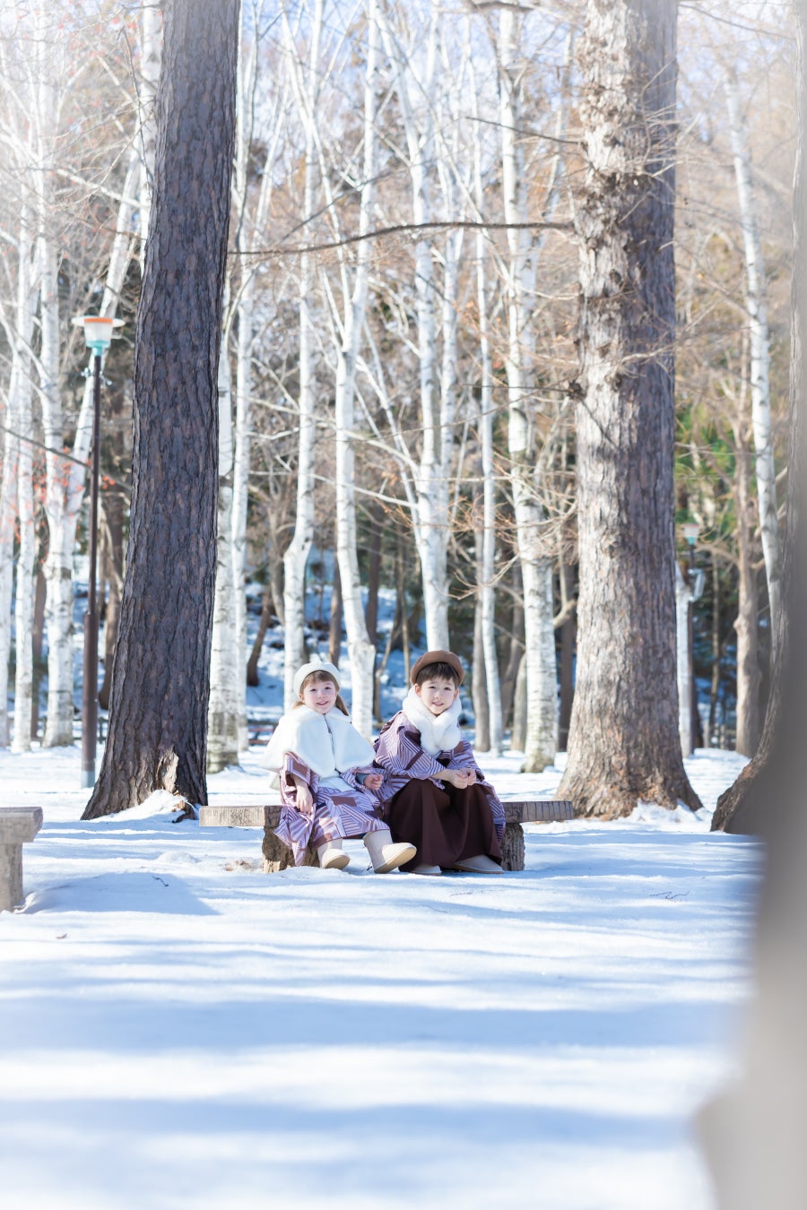 雪の中での撮影は寒くて心配なご家族様が多いですが他の季節ではできないコーディネートをご提案。
