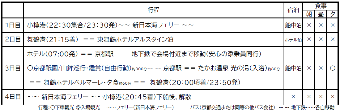 新日本海フェリー往復乗船代・ホテル宿泊代(1泊)・食事代(夕1回)・バス代(2・3日目)・京都市営地下鉄(片道)・たかお温泉光の湯入浴代・消費税等諸税