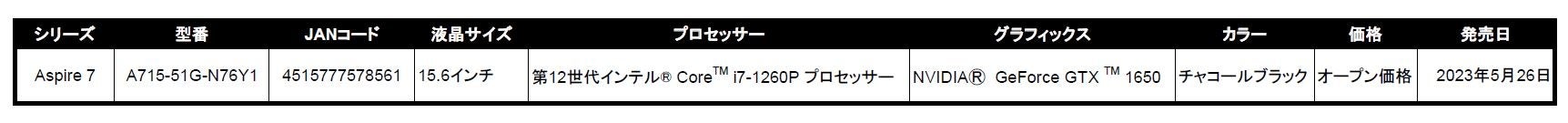 日本エイサー株式会社(本社:東京都新宿区、代表取締役社長:ボブ・セン)は、基本性能をおさえたスタンダードノートパソコン Aspire(アスパイア)シリーズより、Aspire 7の新モデル「A715-51G-N76Y1」を2023年5月26日(金)に発売します。フルHDディスプレイ、第12世代インテル® Core™ i7-1260P プロセッサーを搭載した画面サイズ15.6インチの本モデルは、グラフィックスはNVIDIAⓇ GeForce GTXTM 1650を搭載しており、簡単な写真編集といったクリエイティブな用途はもちろん、カジュアルにゲームも楽しむことができます。趣味にも仕事にも使えるパワフルなノートパソコンをお探しの方にオススメの新モデルです。なお、本製品はAcer公式オンラインストア限定で販売します。