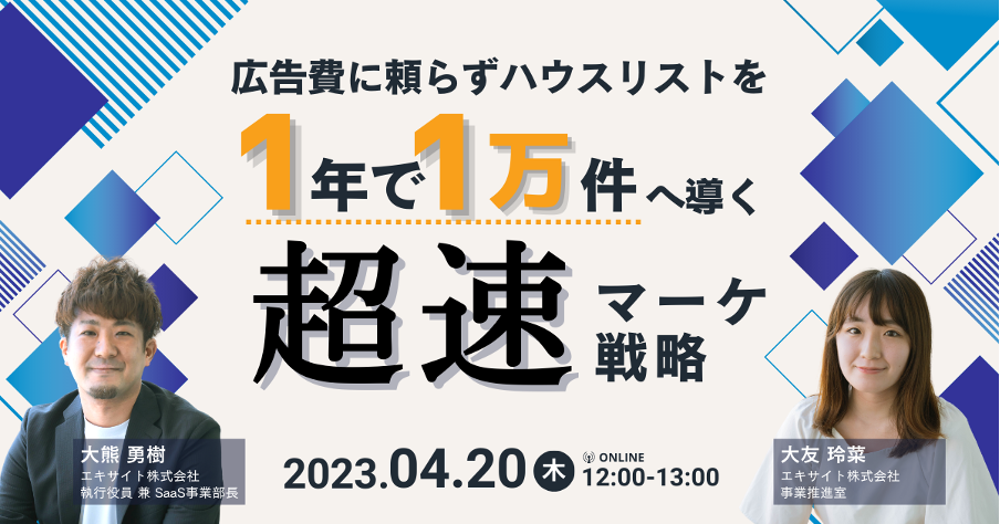 エキサイト株式会社(所在地:東京都港区、代表取締役社長:西條 晋一)は、「広告費に頼らずハウスリストを1年で1万件へ導く超速マーケ戦略」をテーマに4月2日(木)12:00〜参加費無料のウェビナーを開催します。