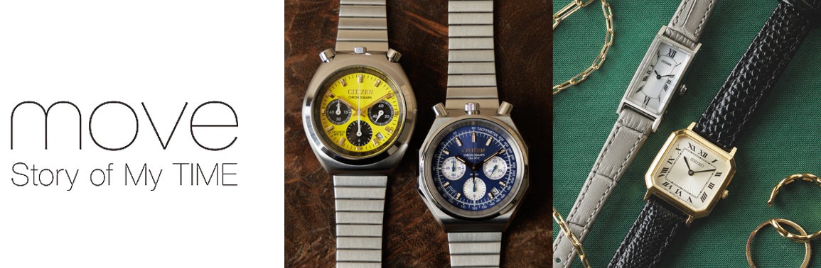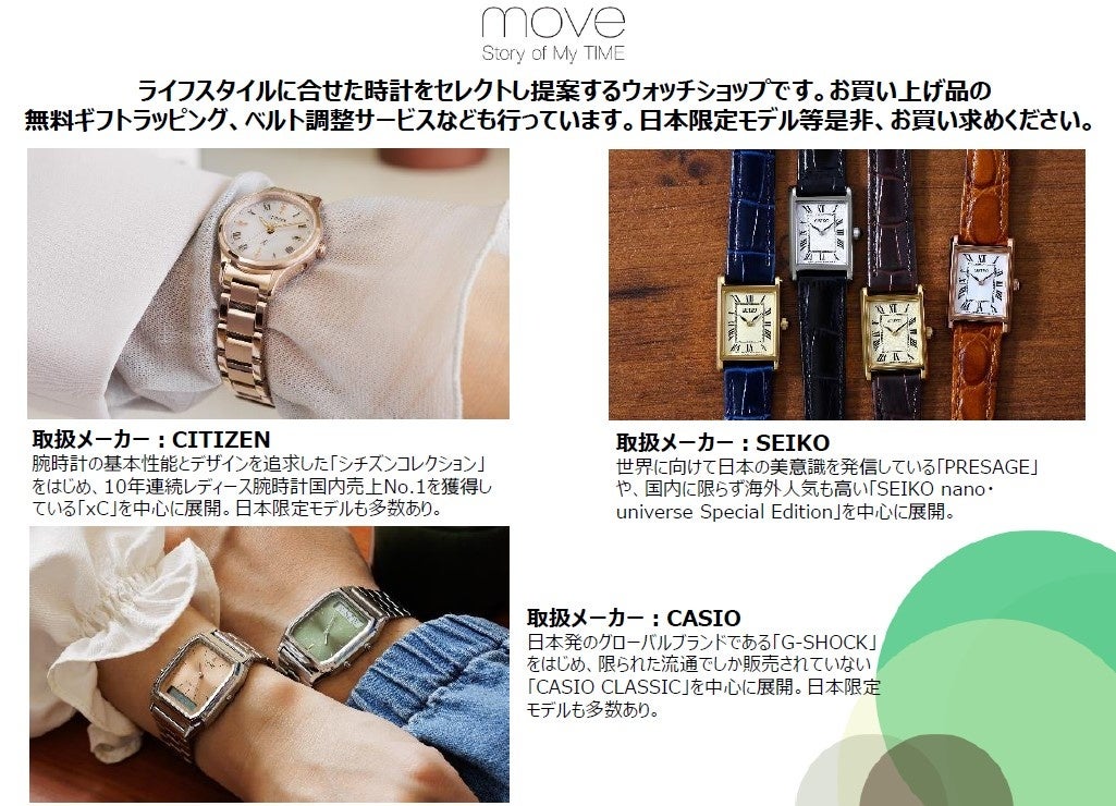 「move(ムーヴ)」は、ライフスタイルに合せた時計をセレクトしたウォッチショップ。“CITIZEN・SEIKO・CASIO”など日本ブランドを中心に、日本でしか買えないモデルも豊富に取り揃えております。