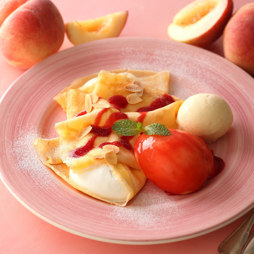 【キハチ カフェ】夏の人気No.1「白桃のパフェ」や、桃の果肉をごろっと添えたクレープなどが登場!旬の桃を楽しむ「ピーチスイーツフェア」を開催