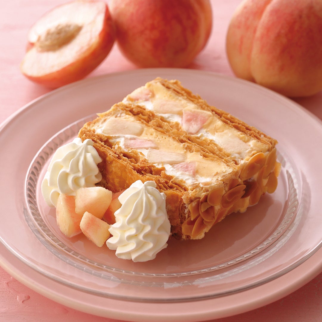 KIHACHIの定番ナポレオンパイを白桃でアレンジ。フレッシュの白桃、サクサクパイ生地、クレーム・シャンティとディプロマットクリームを丁寧に重ねました。