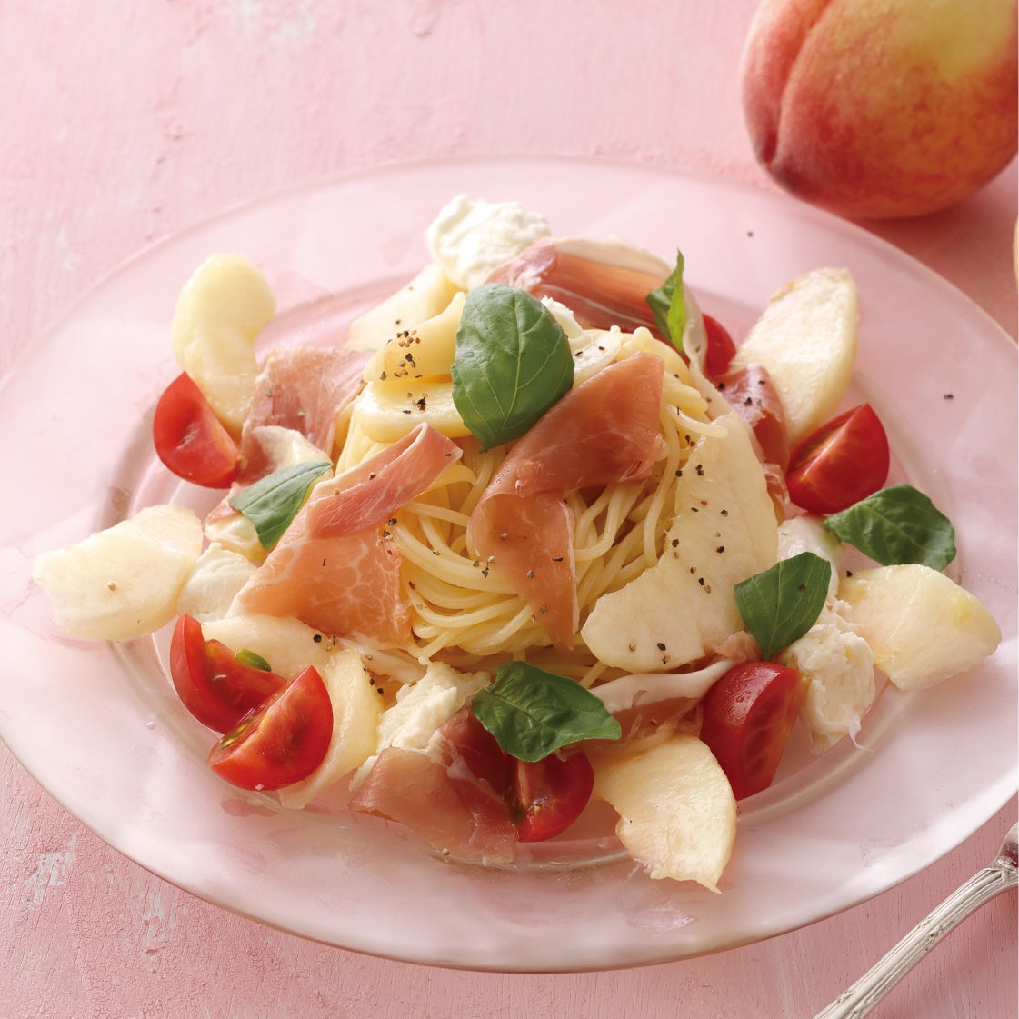 さらに、ピーチスイーツフェアの期間中に、桃をテーマにした冷製パスタ「白桃と生ハム、モッツァレラチーズの冷たいスパゲッティ」も登場。旬の桃を味わいながら、優雅なひとときをお過ごしください。