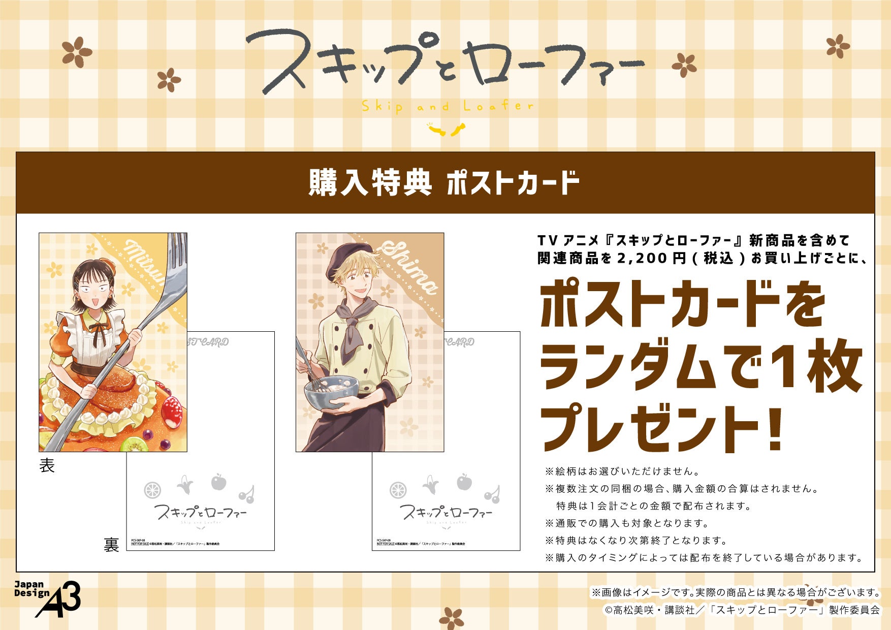 TVアニメ『スキップとローファー』の新作グッズを含む関連商品を2,200円(税込)お買い上げごとに、ポストカード(全2種)をランダムで1枚プレゼントします。
