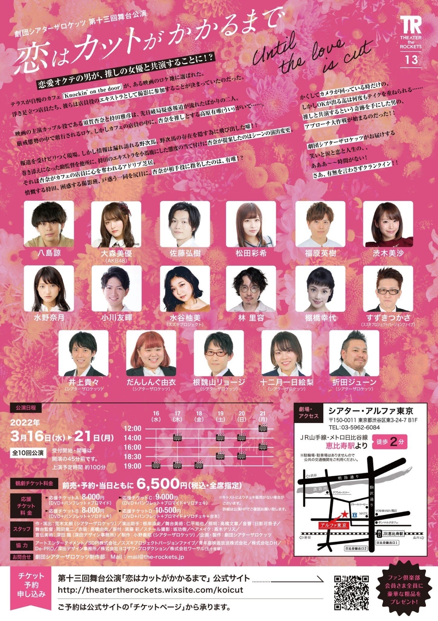 劇団シアターザロケッツ第十三回舞台公演『恋はカットがかかるまで』が2022年3月16日 (水) ~2022年3月21日 (月・祝)にシアター・アルファ東京(東京都渋谷区)にて上演されます。チケットはカンフェティ(運営:ロングランプランニング株式会社、東京都新宿区、代表取締役:榑松 大剛)にて発売中です。