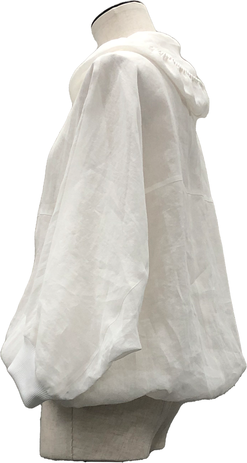 昨年も抄繊糸を使用したアイテムを発売したところ、軽い着心地やイージーケアであることから大変ご好評いただきました。今年は、これまでよりも細い糸が開発されたので、透けて見えるほど粗く織り上げてシアーな素材に進化させました。さらっとした風合いや、熱がこもらず快適に過ごせる、紙からできた生地の良さを感じられるショートブルゾンが完成しました。
